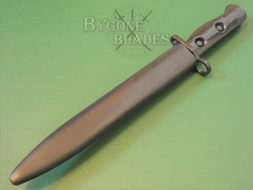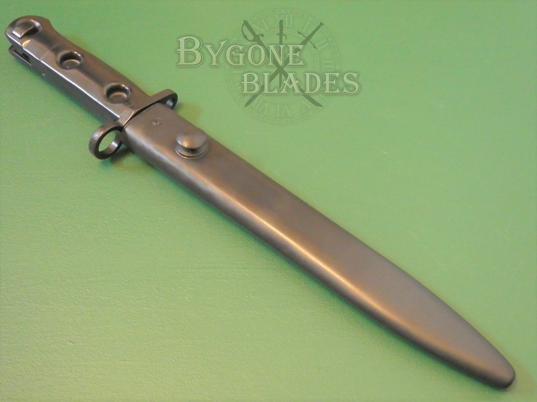 The bayonet is complete with a Mk5 scabbard. The Mk5 scabbard was used for several British bayonets, from the Mk5 bayonet through to the L1A4 from around 1940 into the 1980’s. The scabbard is in excellent condition.
