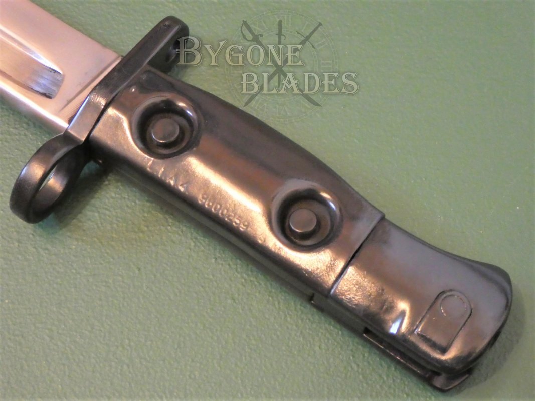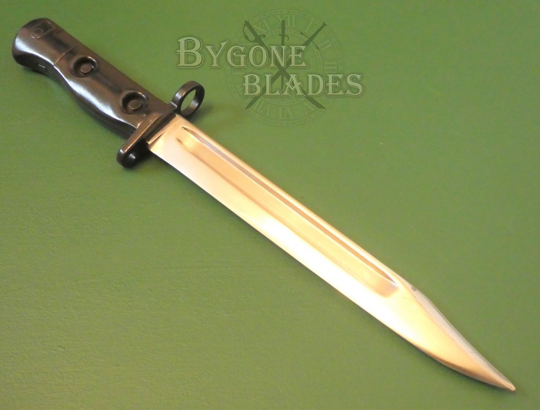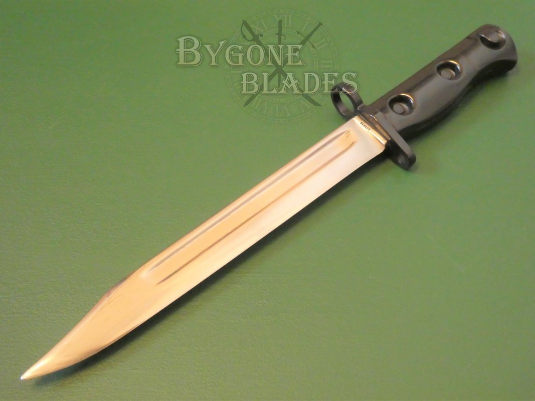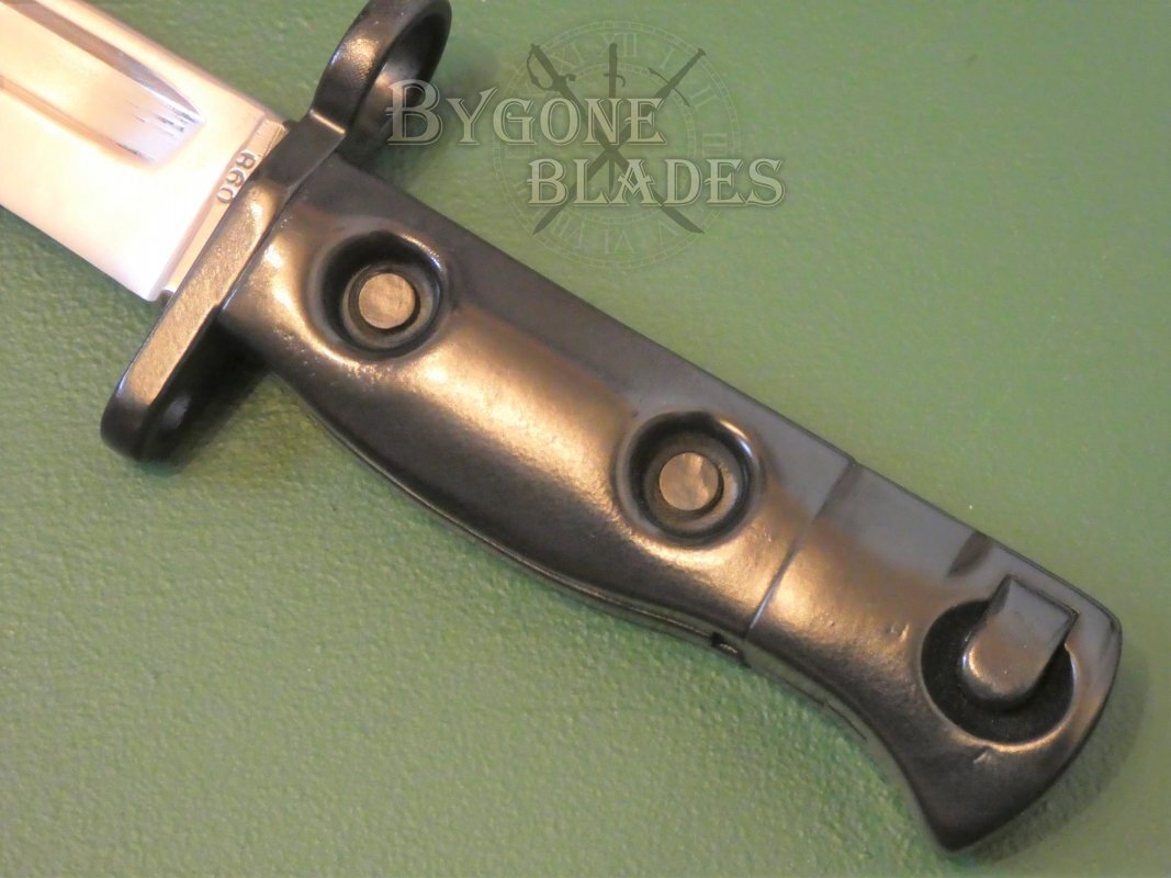 The 200mm single edged blade has a rounded spine and a sharpened clip point. This blade has a long fuller, unlike the late production L1A3 blade with its shortened fuller. The ricasso is stamped with “B60.” It is possible that this bayonet utilised an early L1A3 long fullered blade and it also has the early L1A3 waisted crosspiece, which was phased out and replaced with a straight, non-waisted crosspiece on later L1A3 and L1A4 bayonets.