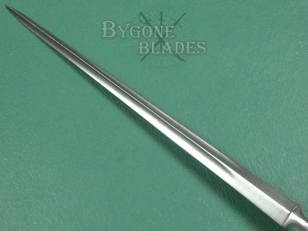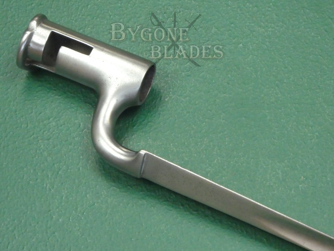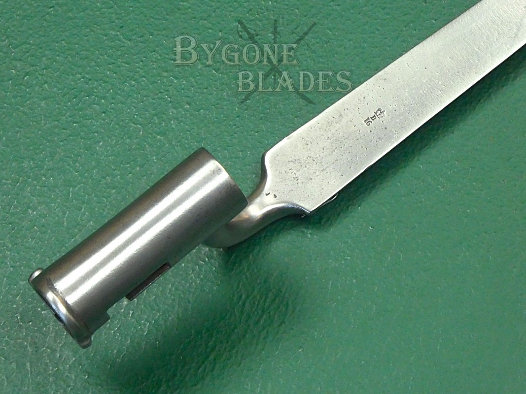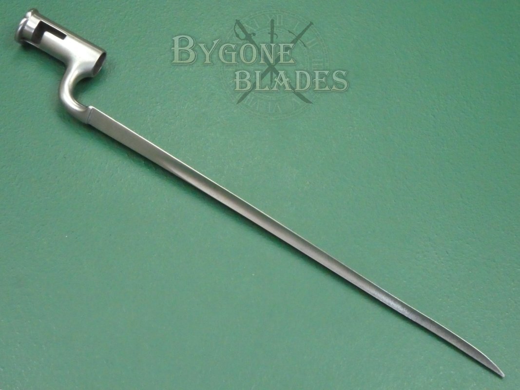 This 1851 pattern bayonet has an overall length of 528mm. The socket is 76mm in length with a muzzle diameter of 22.8mm. The blade is 427mm long. The triangular blade has twin fullers on the underside and a flat, un-fullered face. The base of the blade bears the remnants of a maker’s mark and the forte is deeply stamped with a Birmingham inspection mark.