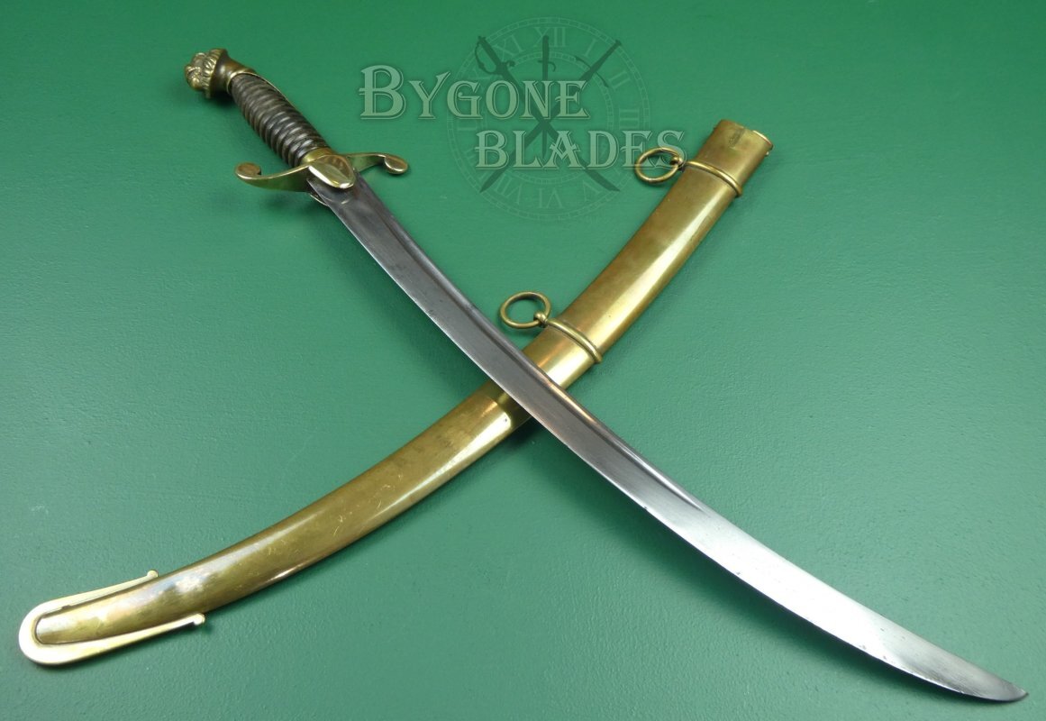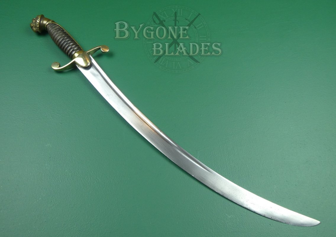 This rare naval midshipman’s hanger dates to around 1820-1840 and is in effect a throwback to the pre-cutlass days of the Royal Navy. The period from which this hanger dates was a time of much change and uncertainty amongst manufacturers, with several new patterns of cutlass being proposed as replacements for the 1804 double disk pattern. These patterns were often accepted by the Board of ordnance and then summarily rejected as soon as an alternative pattern was suggested. All before the manufacturers were able to produce any. Finally, in the early 1840’s a new pattern of naval cutlass was proposed and accepted. This cutlass went into production and is today recognised as the pattern 1845 naval cutlass. During this time of uncertainty, two Birmingham cutlers are known to have produced a small number of curved hangers conforming to the pattern of this example. These cutlers were J & R Mole and James Boydell, trading as the Oak Farm Company. It is unclear as to whether hangers of this pattern were produced as examples for the Board of ordnance and Admiralty or whether they were intended for private purchase by merchant sailors.