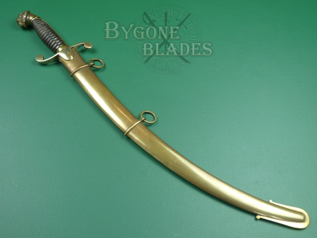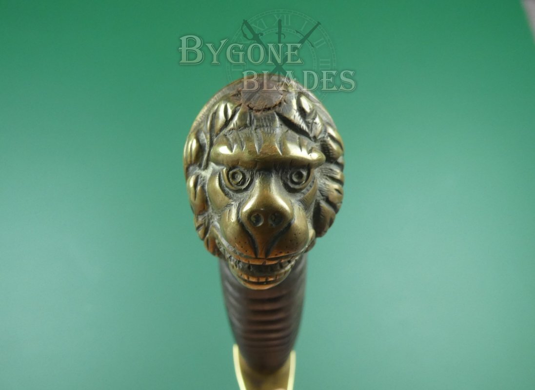 The brass hilt has an elongated s-shape cross piece with domed languets and inverted disk quillons. The pommel is in the form of a forward facing lion mask. The grip is of ridged horn and is in great condition. The blade is firm in the hilt.