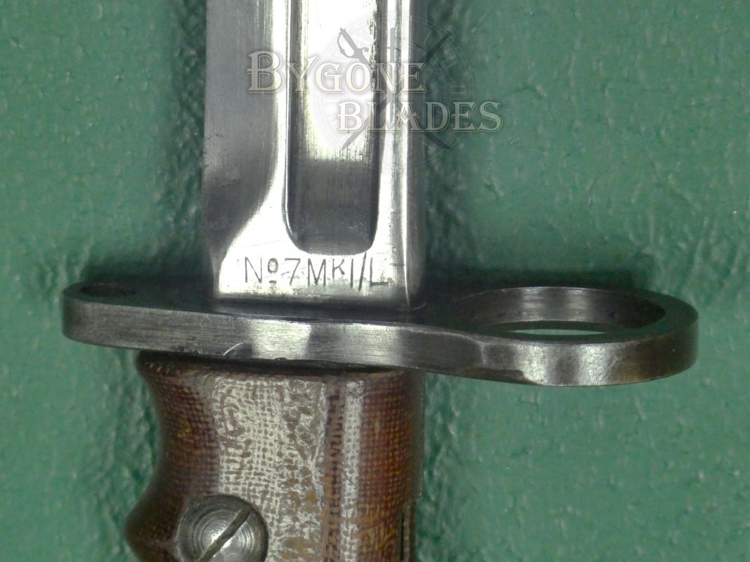 The No7 Mk 1 Land service bayonet was designed in 1944 and a total of only 330,000 were produced. The design was perfected by the Wilkinson Sword Co., who produced 1,000 bayonets in 1944 and subsequent production was carried out by four others makers, Elkington, Poole, BSA & Newport, from 1945 until 1948.