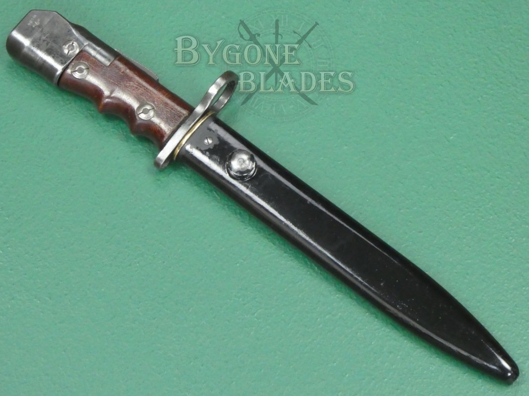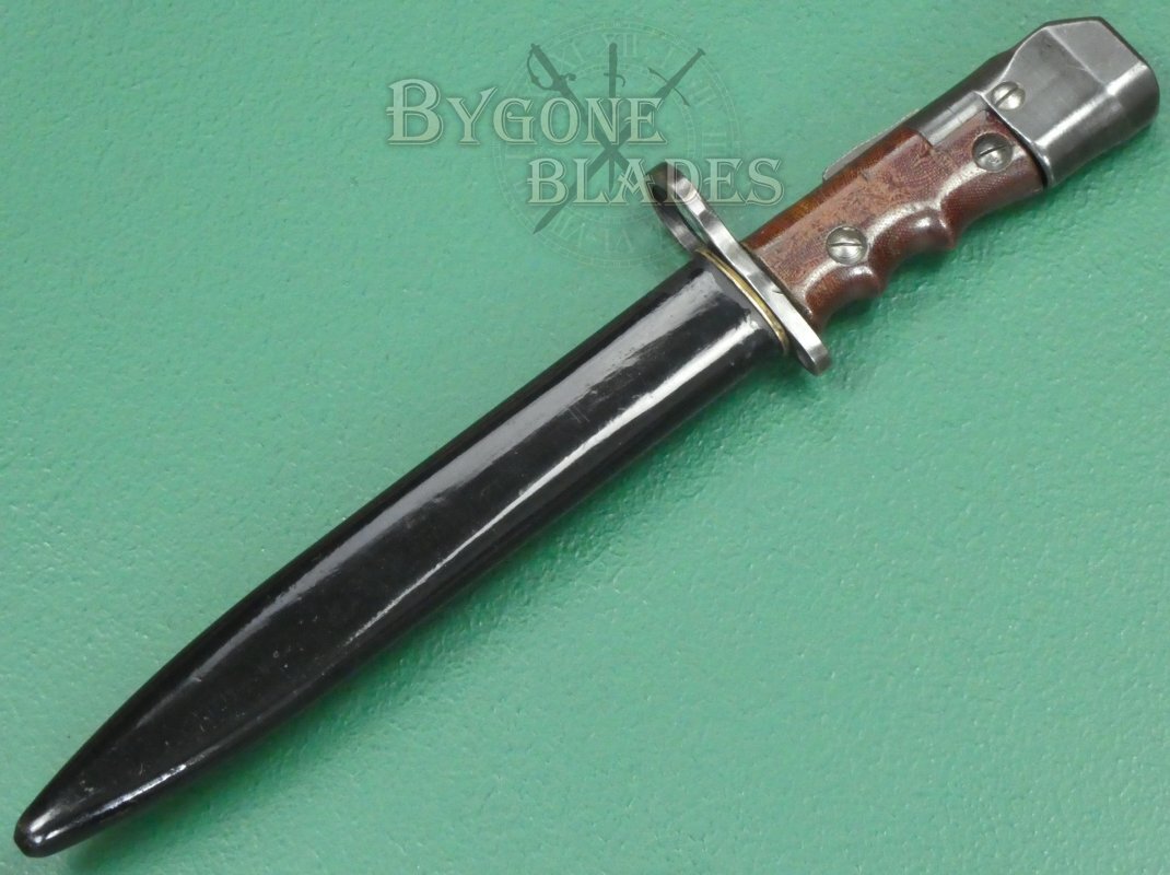 These scarce bayonets were made for use with the Sten Mk V sub machine gun. Originally, they were also intended for the Lee Enfield No.4 rifle but after incidents involving rounds hitting the muzzle ring they were only issued with this rifle for parade purposes.