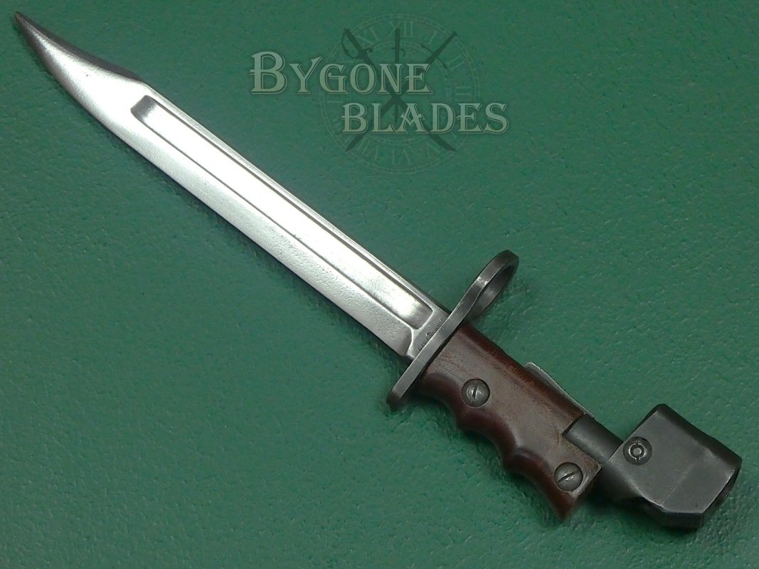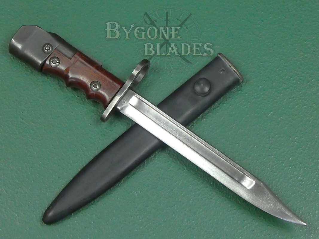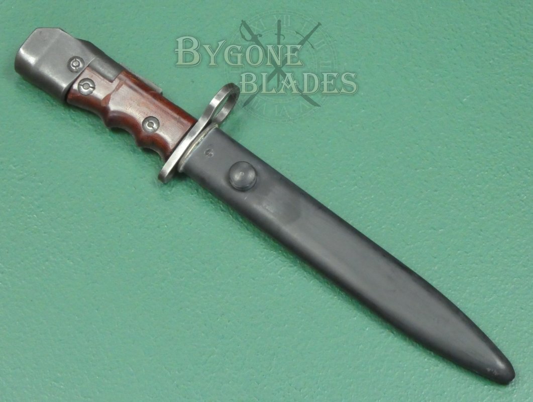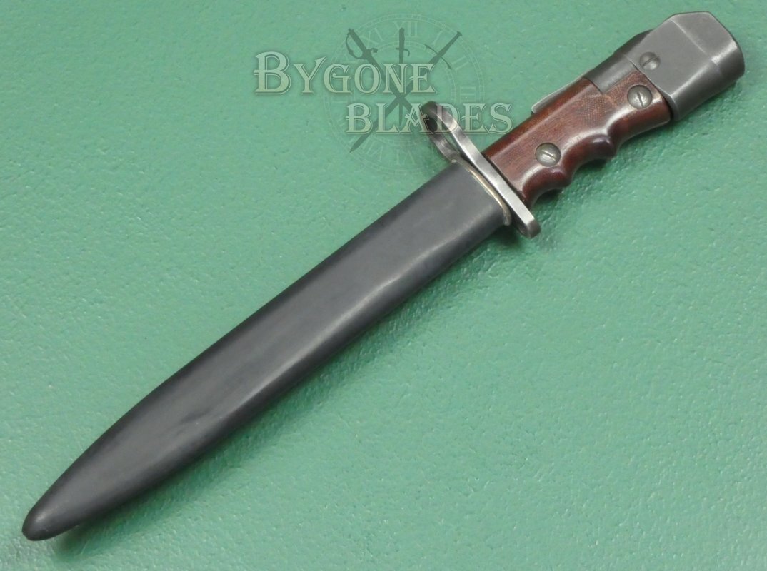 These scarce bayonets were made for use with the Sten Mk V sub machine gun. Originally, they were also intended for the Lee Enfield No.4 rifle but were only issued with this rifle for parade purposes due to incidents involving rounds hitting the muzzle ring.