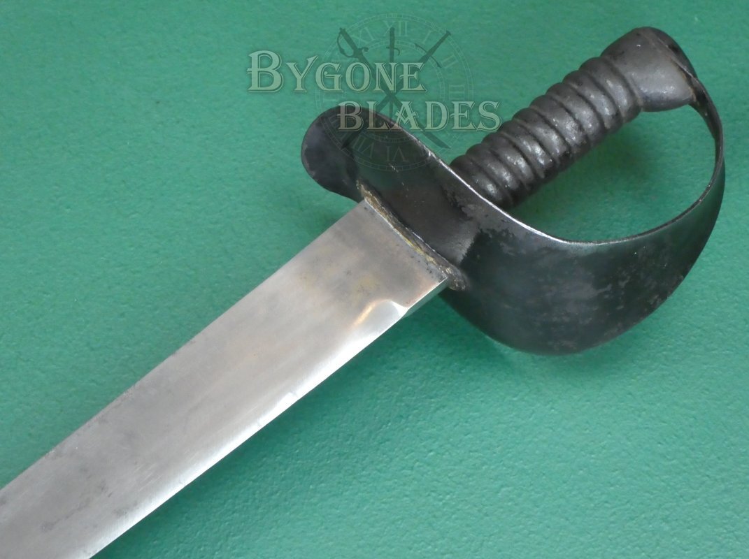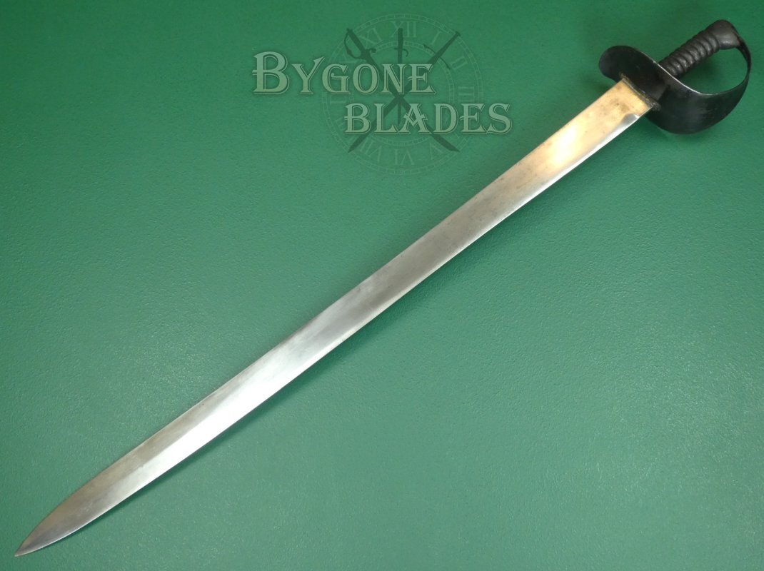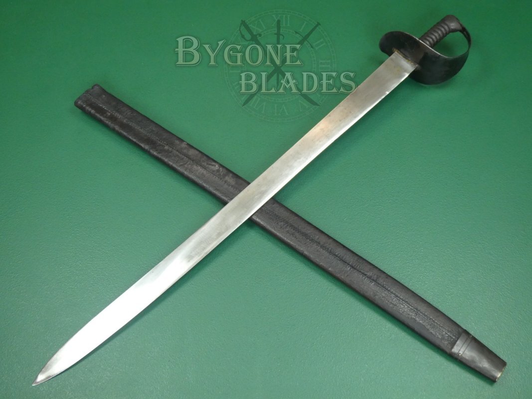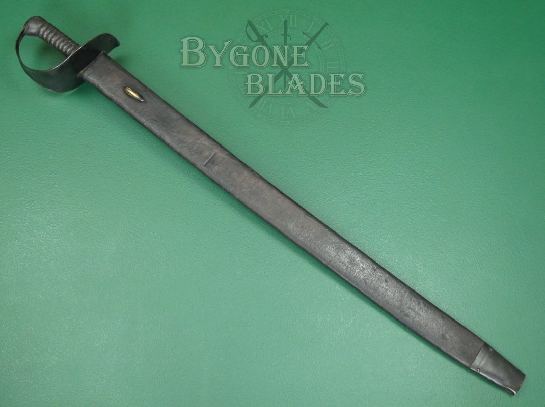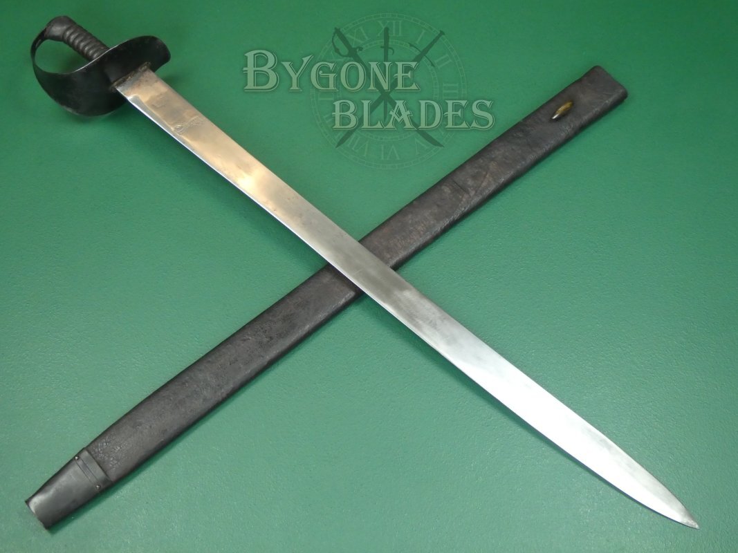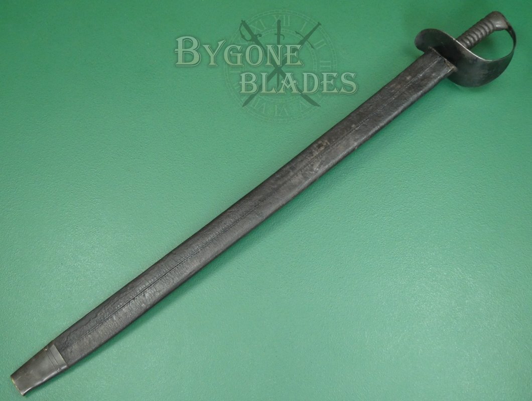 The cutlass is complete with its leather scabbard with blackened brass frog stud and chape. The scabbard is in good condition with age related wear and crazing to the finish. It is rare to find one of these cutlasses with a scabbard. The cutlass sheathes and draws smoothly and is held firmly within the scabbard.