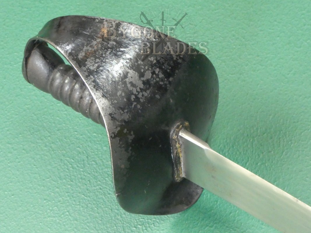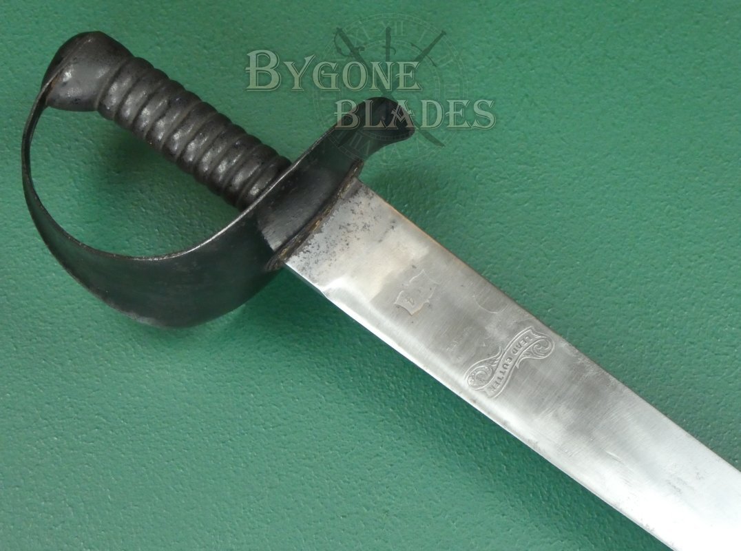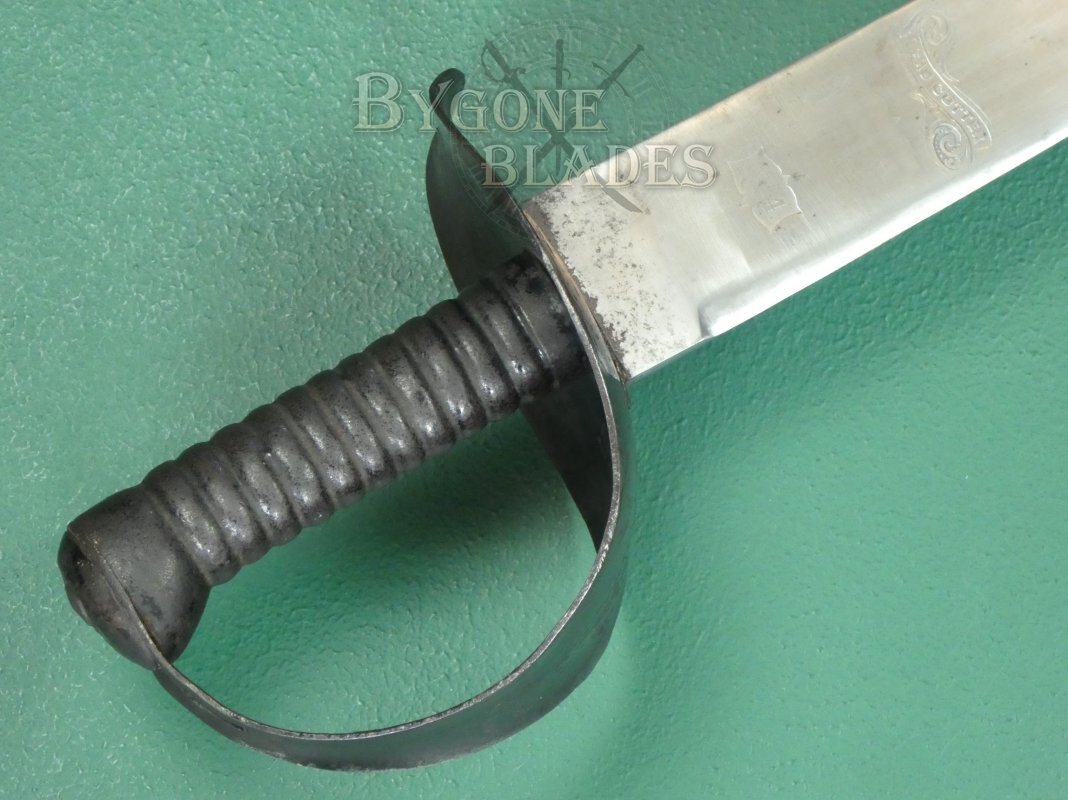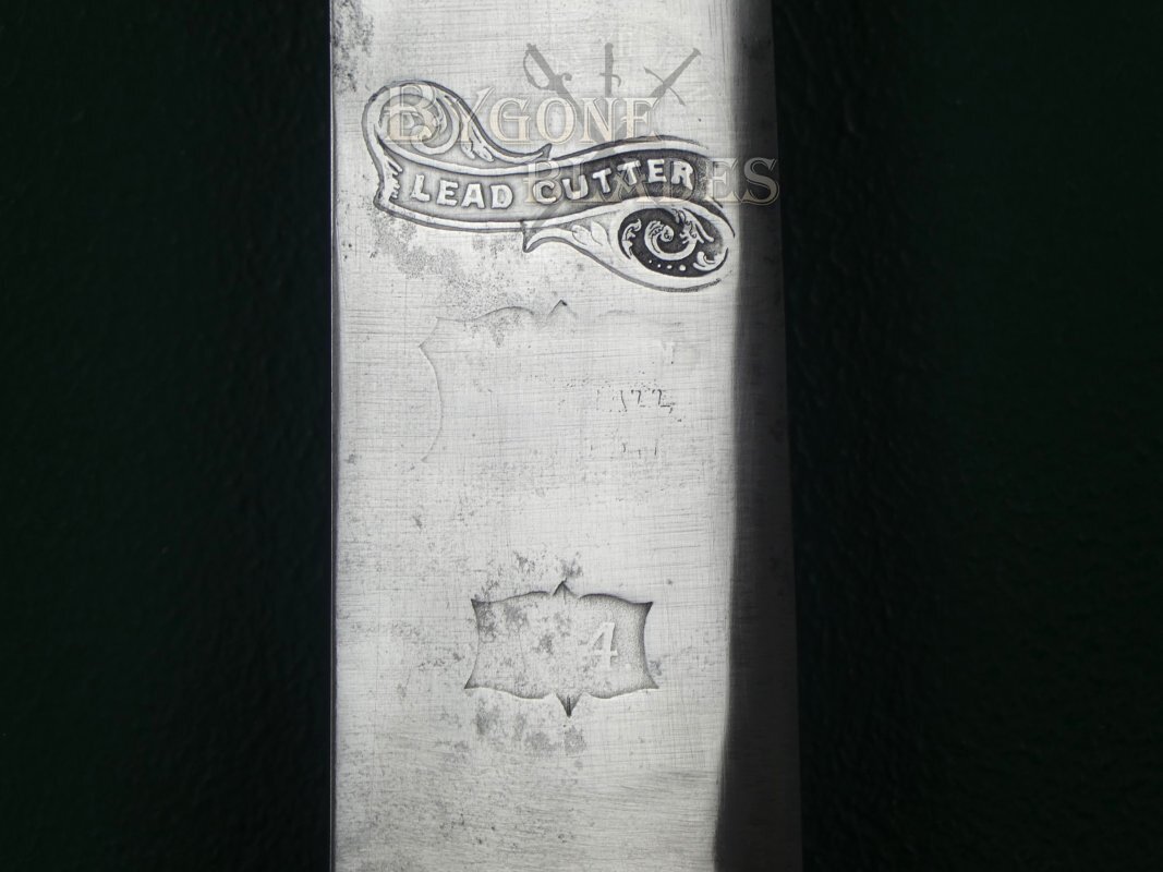 The 835mm single-edged blade has a flat spine and terminates in a double-edged spear point. The unfullered blade is 51mm wide at the ricasso and retains a very sharp edge. The forte is etched with a scrolled banner containing the name “Lead Cutter” above a worn cartouche that would have displayed the Wilkinson makers name and logo. Years of post use polishing have rendered the details illegible. Below this is a smaller cartouche, also worn but still showing the number 4. The spine is clearly stamped with the Wilkinson serial number 19525, indicating that the sword was made in 1874. It may be possible to get a copy of the Wilkinson ledger entry which could show further details.