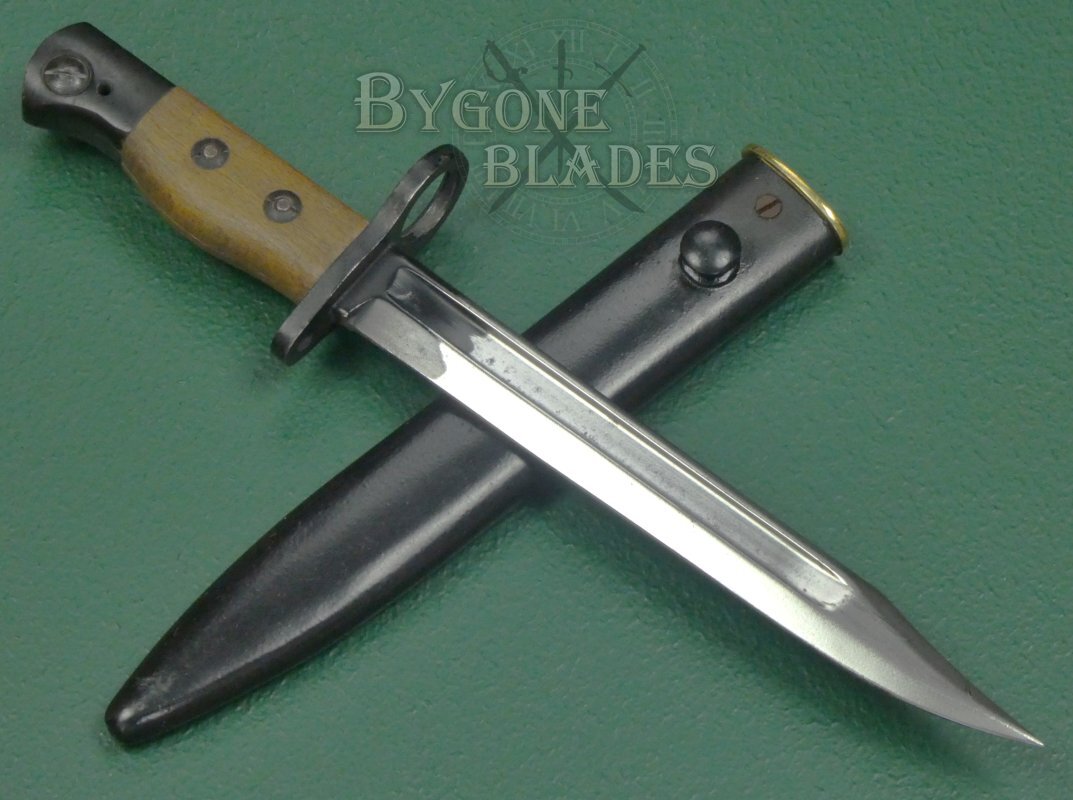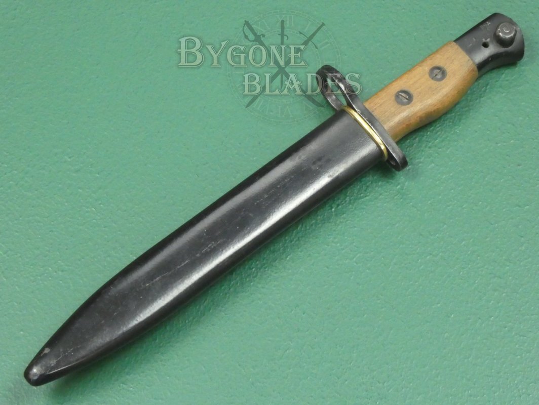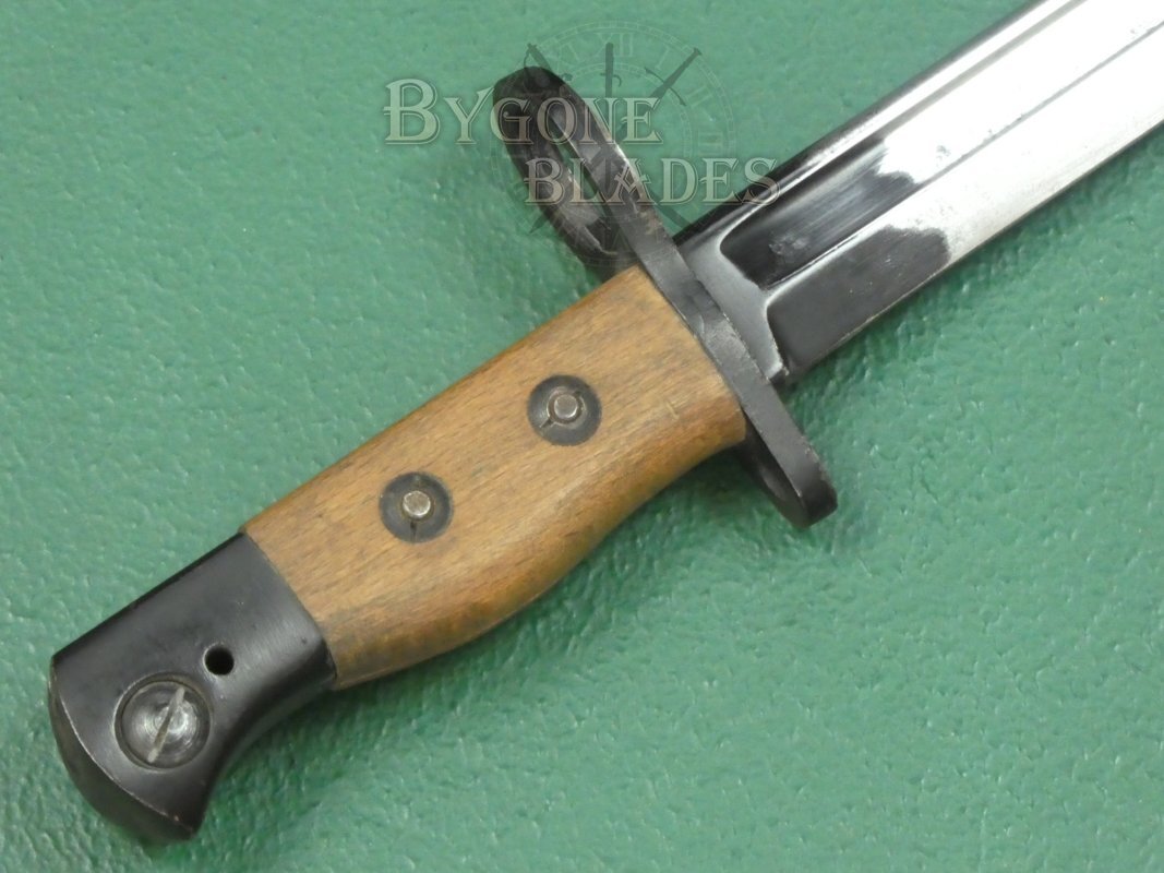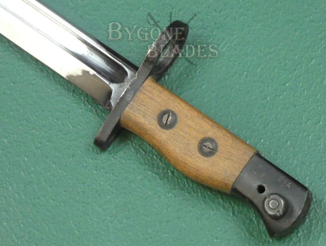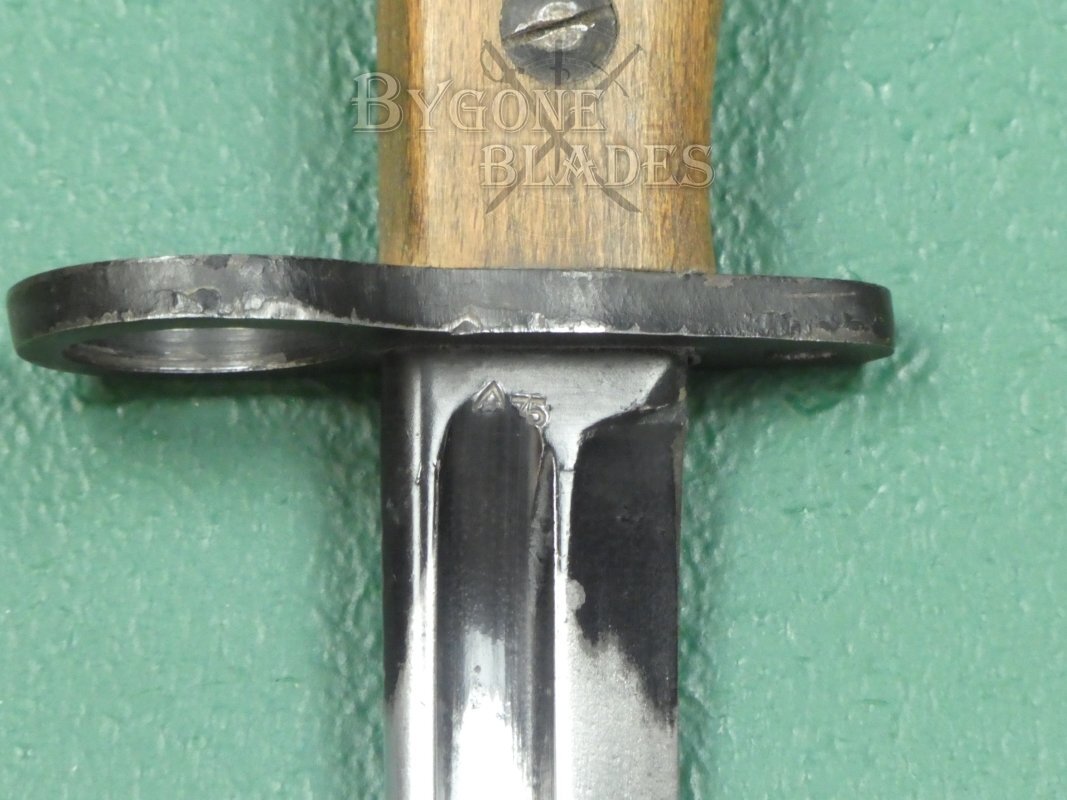 This British No.5 bayonet was made by Hopkinson of Sheffield in 1975 for use with the Sterling Sub Machinegun. It is quite scarce. The Sterling SMG was trialled by the British army late in WW2, between 1944-1945, but did not come into regular service until 1953. The Sterling SMG was also supplied to a variety of overseas military and police units. Surplus MOD parts from the No.5 Jungle carbine bayonet were often used in their construction. The No.5 pommel, wooden grip scales and grip screws on this bayonet are examples of this. The pommel was produced by the Birmingham Small Arms Factory (B.S.A.) under MOD contract.