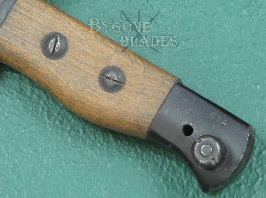 The wrap around hardwood grip scales are in good condition and are held tightly in place by two screws. The press stud is in perfect working order. The pommel and cross-piece retain their original finish. The pommel is stamped BSA over C. The pommel has a clearing hole, indicating that it was an original No.5 bayonet part. Newly made Sterling SMG bayonets do not have a clearing hole.