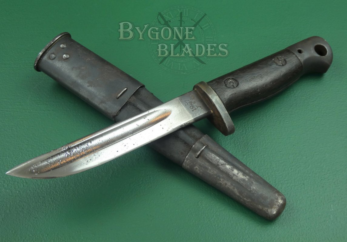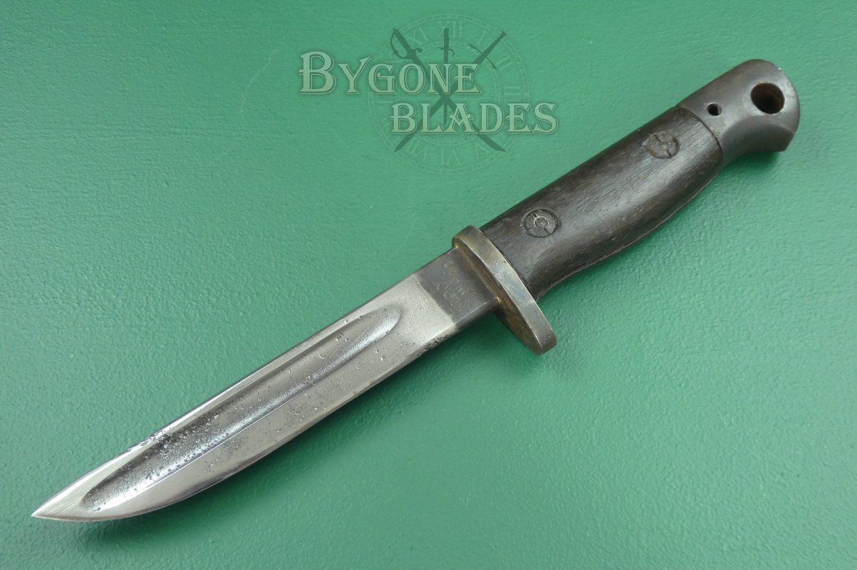 A military fighting knife is a combat knife designed to kill or gravely incapacitate an enemy soldier at close quarters. These knives was developed in response to a need for a close combat weapon for soldiers conducting assaults and raids. The famous Fairbairn Sykes commando knife was more often than not, a private purchase item by soldiers during WW2 but often these weapons were made by the troops themselves from cut down bayonets. Later, company armourers undertook the task of shortening bayonets for use by the troops.