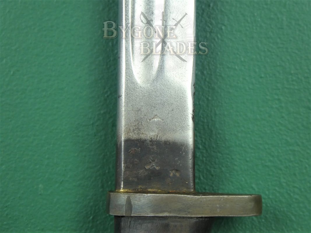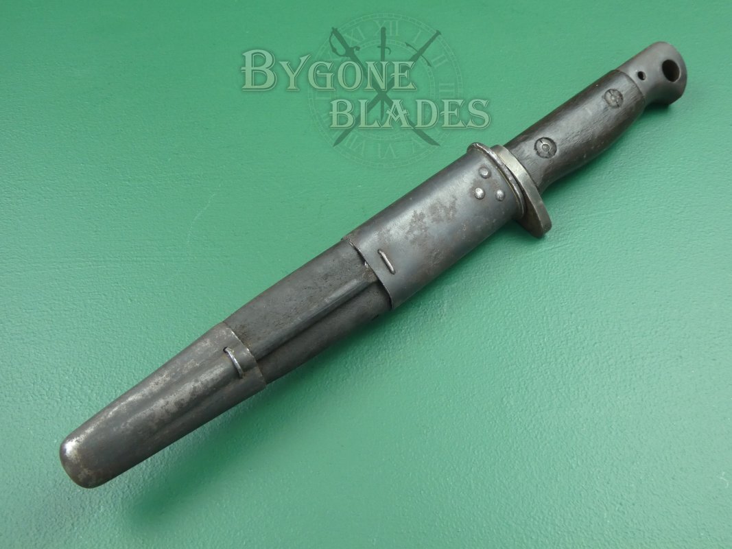 The bayonet’s original scabbard was adapted to accommodate the shortened blade. The scabbard is in fair condition with a tear in the leather below the locket. The stitching of the seam is intact. The throat and chape retain most of their original blueing and the knife sheathes and draws smoothly and is held firmly within the scabbard.