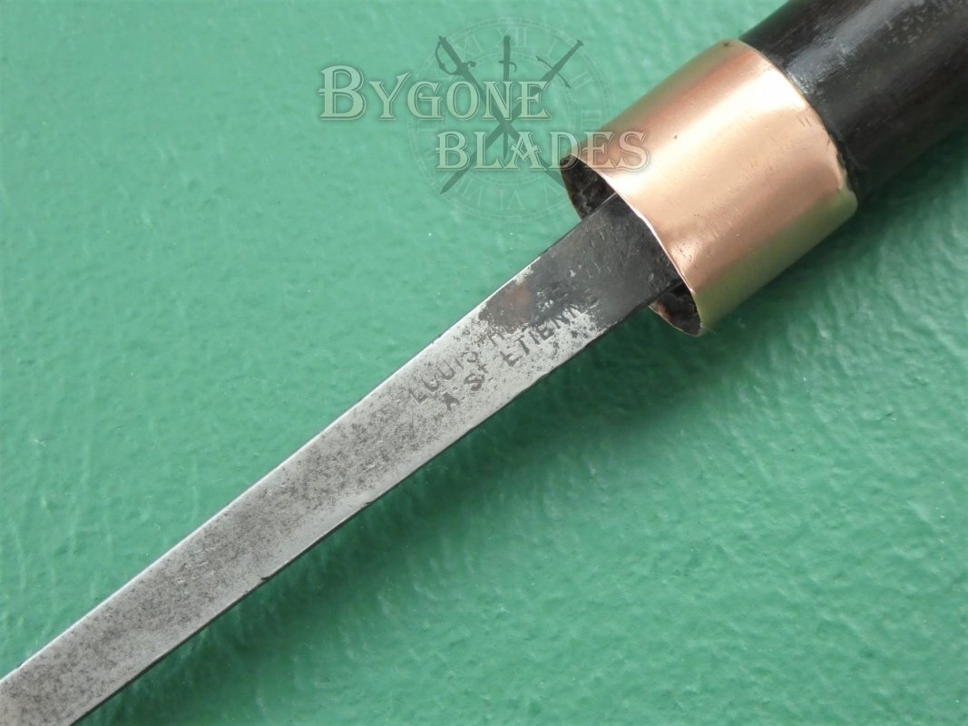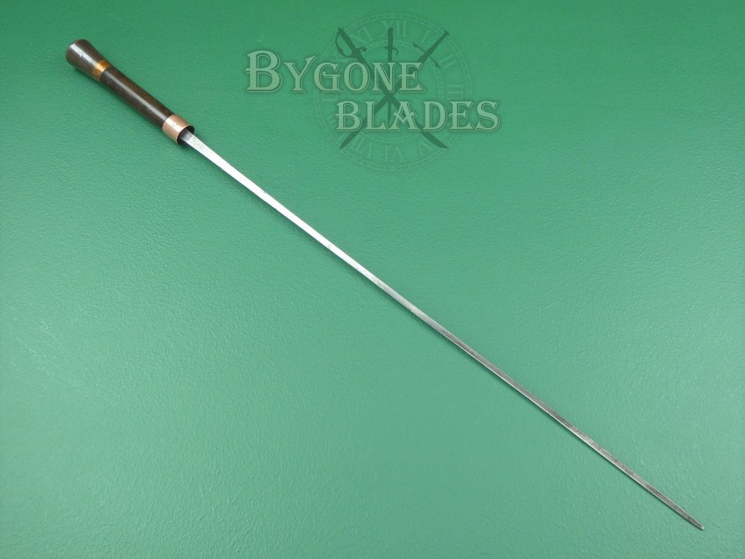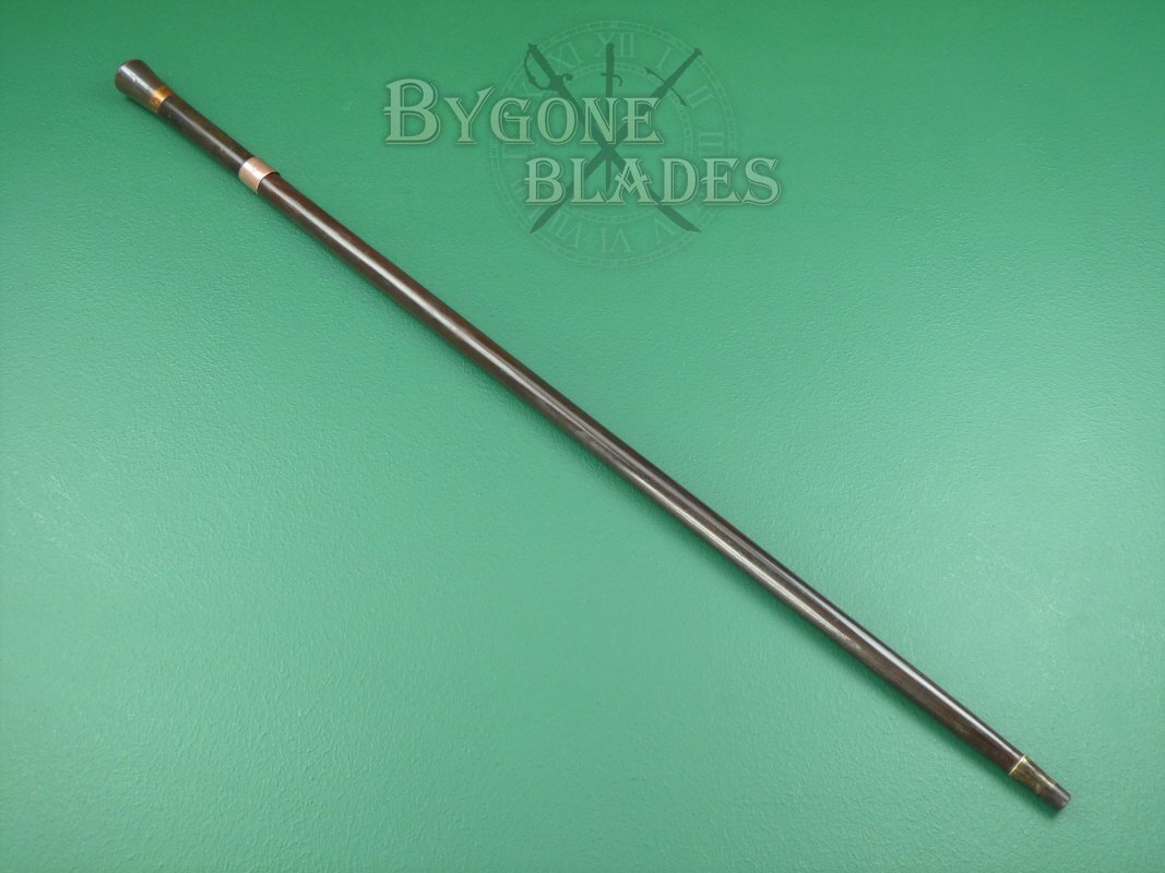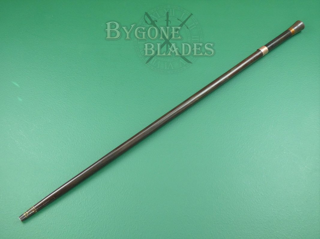 The 608mm thrusting blade tapers to a point and is in good condition. It sheathes smoothly within the body of the cane, fitting snugly without rattle or play. The base of the blade is stamped with the manufacturer’s details. The blade was made at St. Etienne, France although the cane appears to be British.