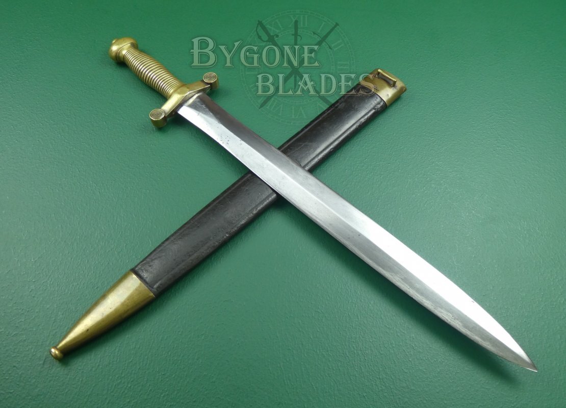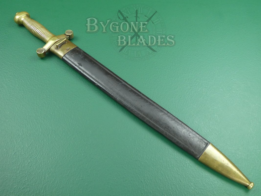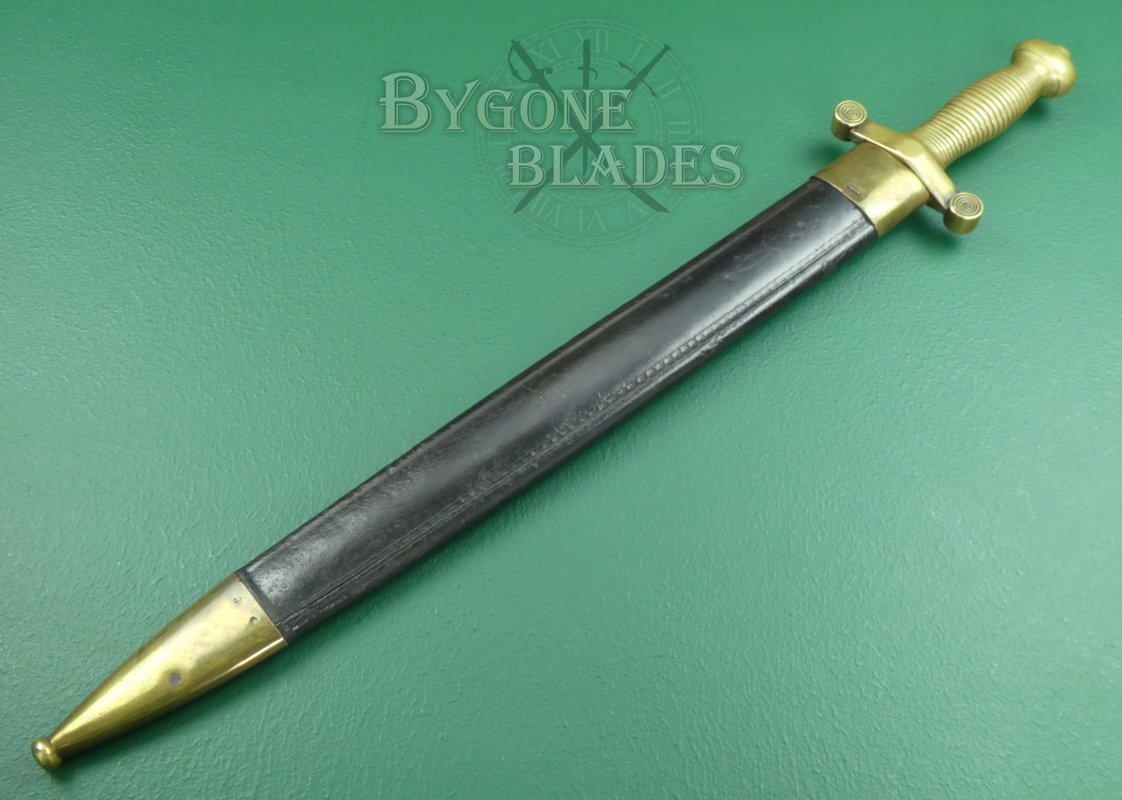 This French Infantry short sword is the Model 1831, “glaive des troupes à pied modèle 1831,” known colloquially by the troops as the “coupe choux” meaning “cabbage chopper.” The Neo-classical design was based on the Roman Gladius.