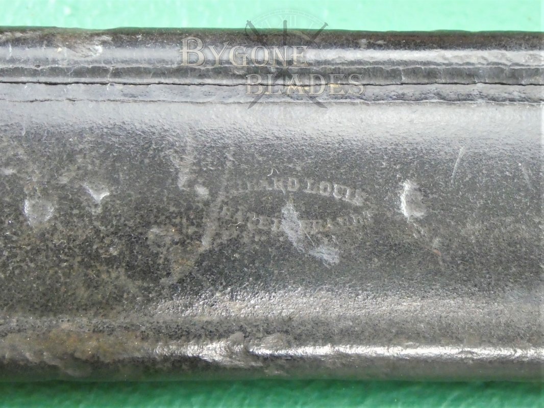 The original issue scabbard is also in fantastic condition. The leather is sound and the stitching intact. The back of the scabbard has worn inspection marks and the maker’s details. The sword sheaths and draws well and is held firmly within the scabbard.
