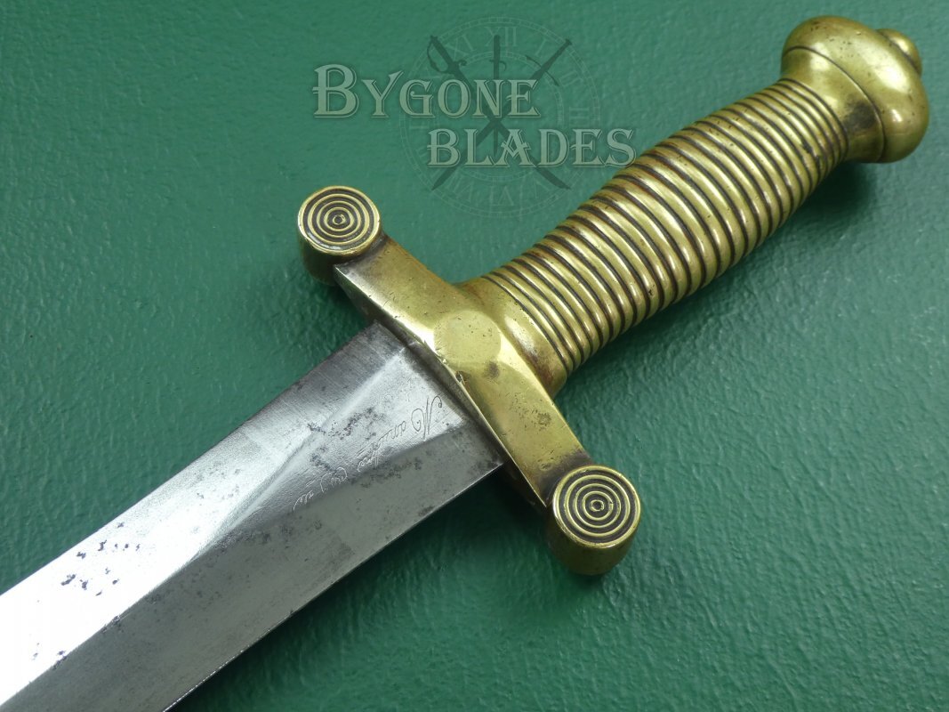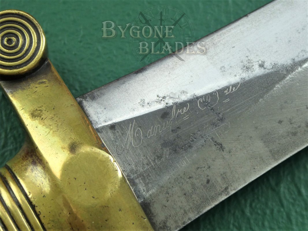 The 486mm double-edged blade has a flattened diamond cross-section and terminates in a spear point. The blade is in excellent condition with some sharpening scratches along the edges. The base of the blade is engraved with the Chatellerault armoury details and the obverse shows the manufacture date of May 1834 above two inspection poincon. The blade is clean and bright with some speckles of tarnish. The blade has been service sharpened and retains its original polish.