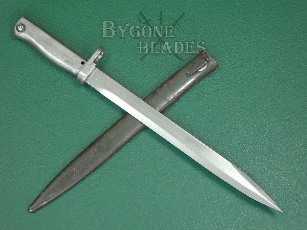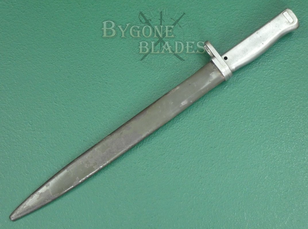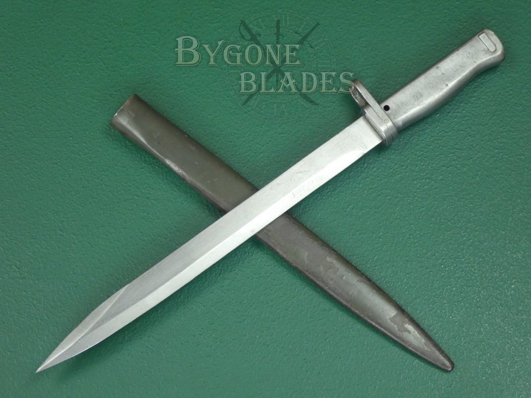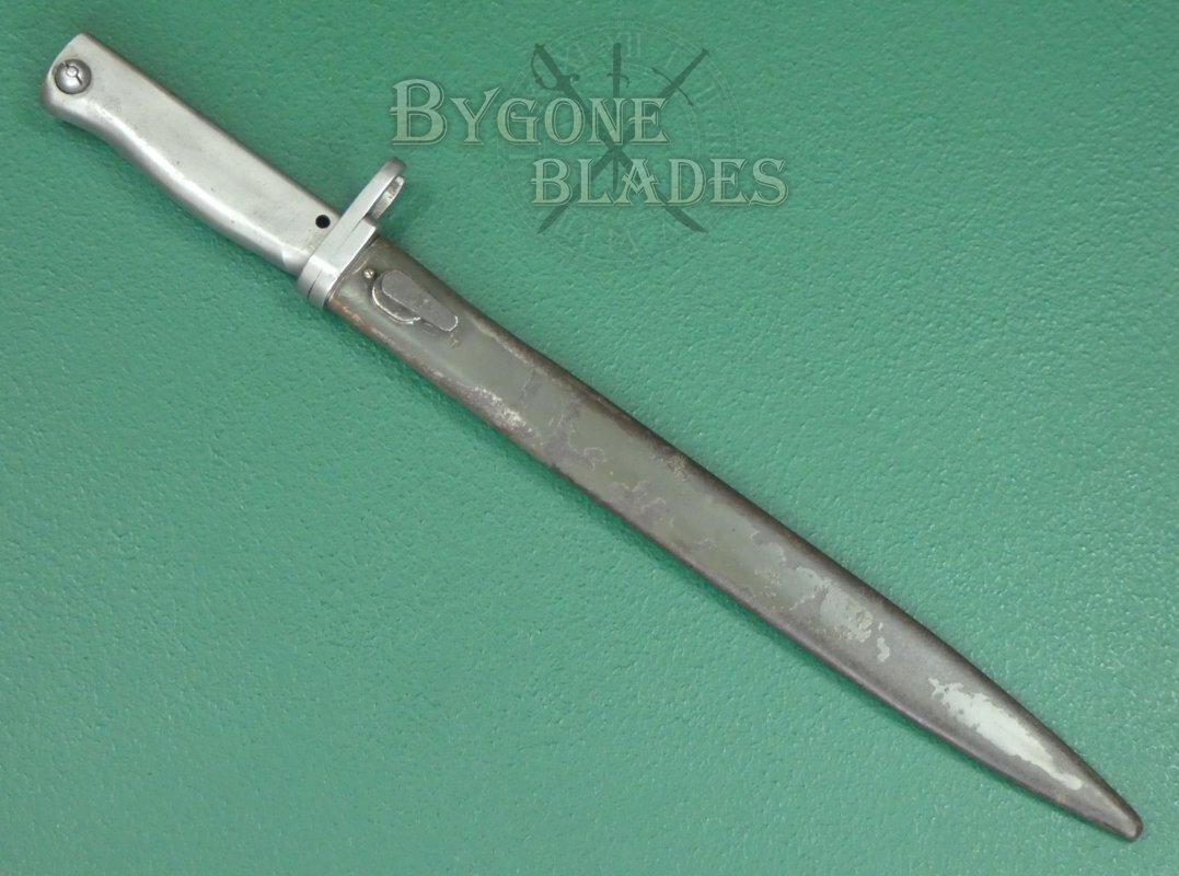 The bayonet is complete with its original ersatz scabbard which retains much of its original paint. The bayonet sheathes and draws smoothly and is held firmly within the scabbard.