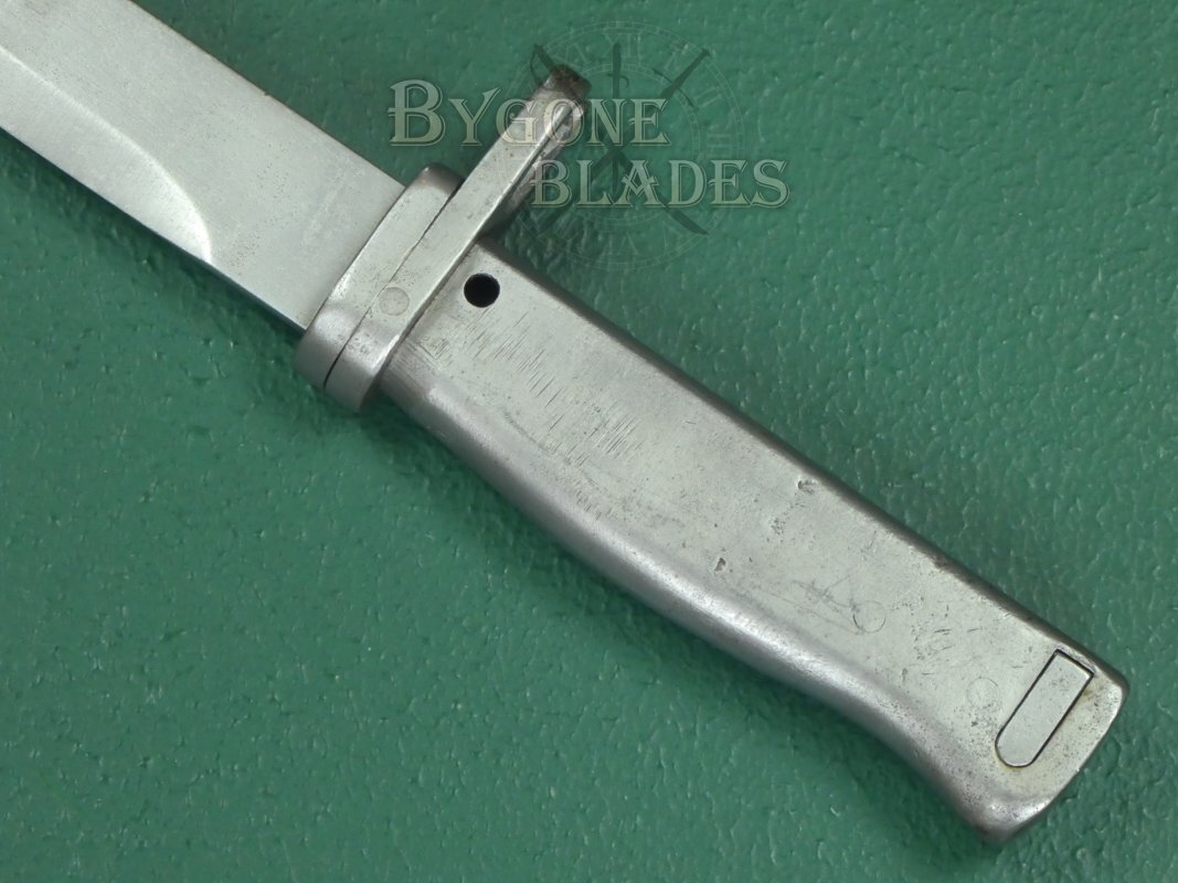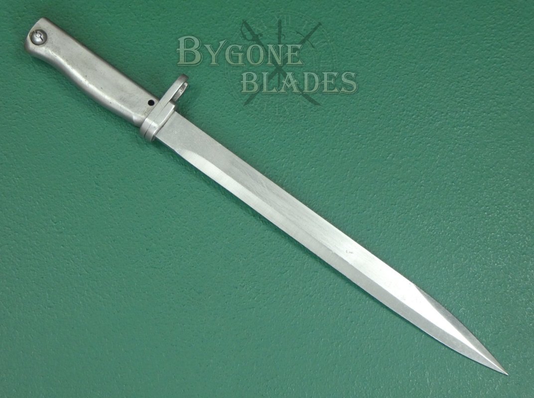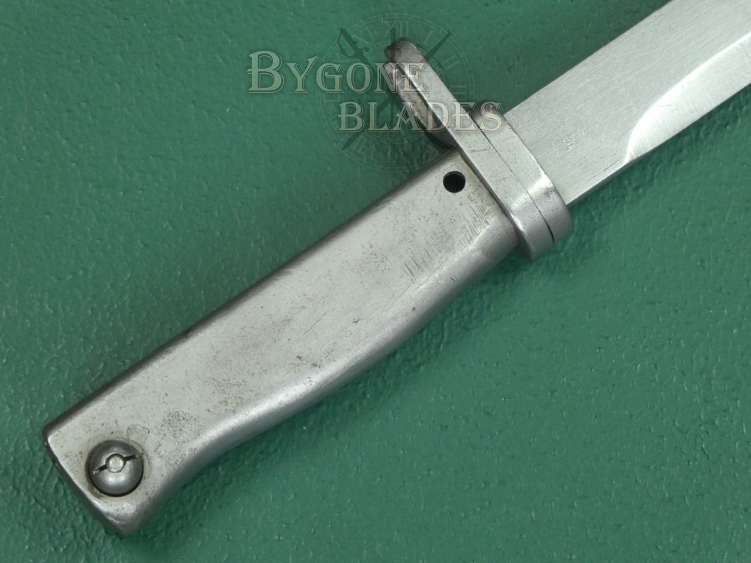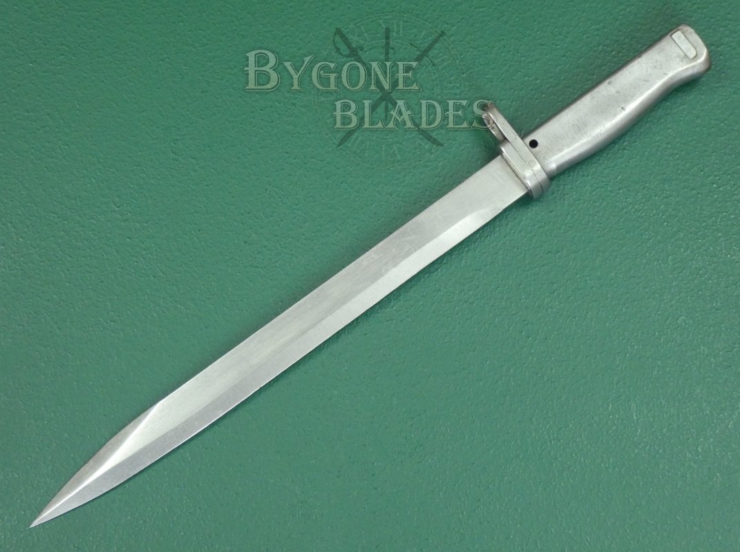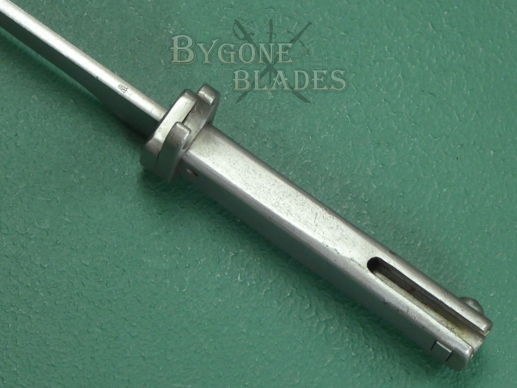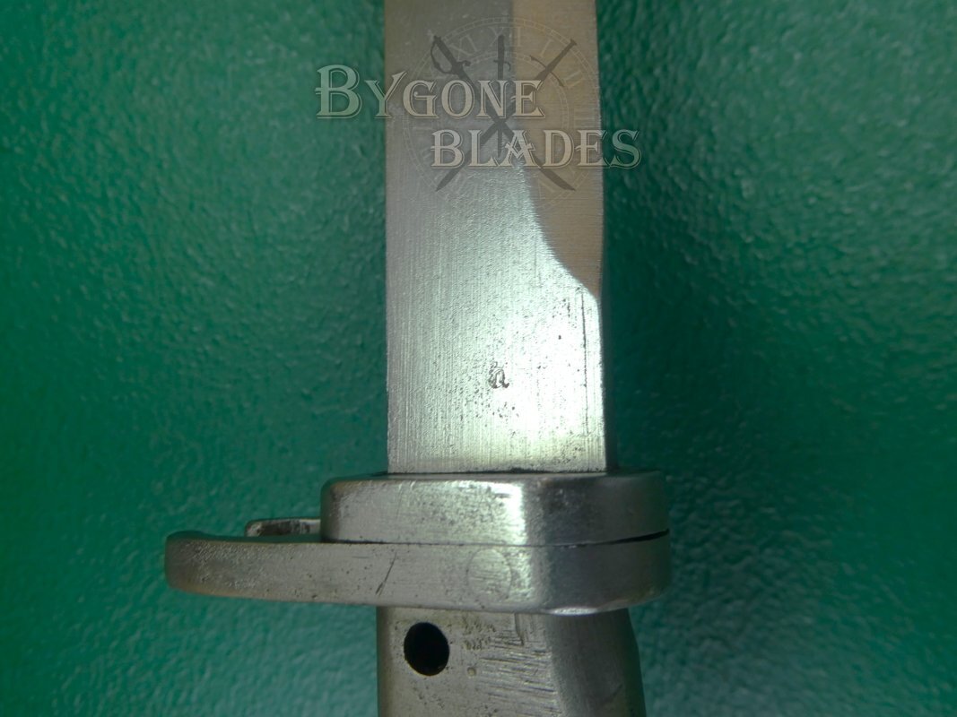The 316mm single-edged blade has a flat spine and terminates in a double-edged spear point. The unfullered blade is in near mint condition and retains its full length. Many ersatz bayonets had their blades shortened, making original length examples harder to find. The spine and ricasso both bear inspection stamps.