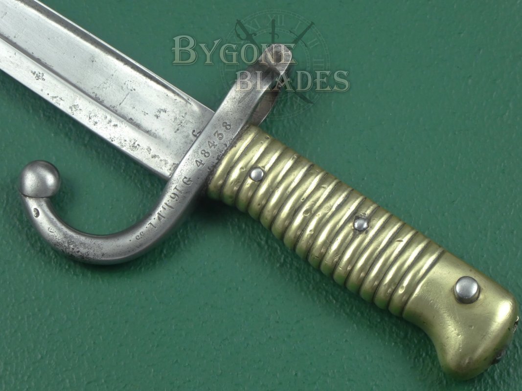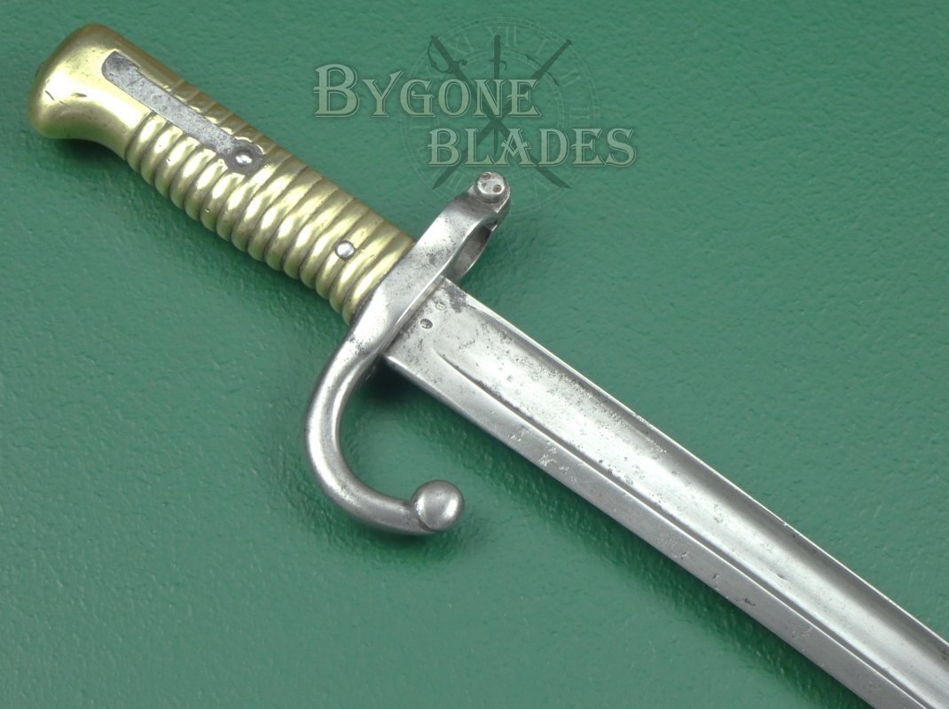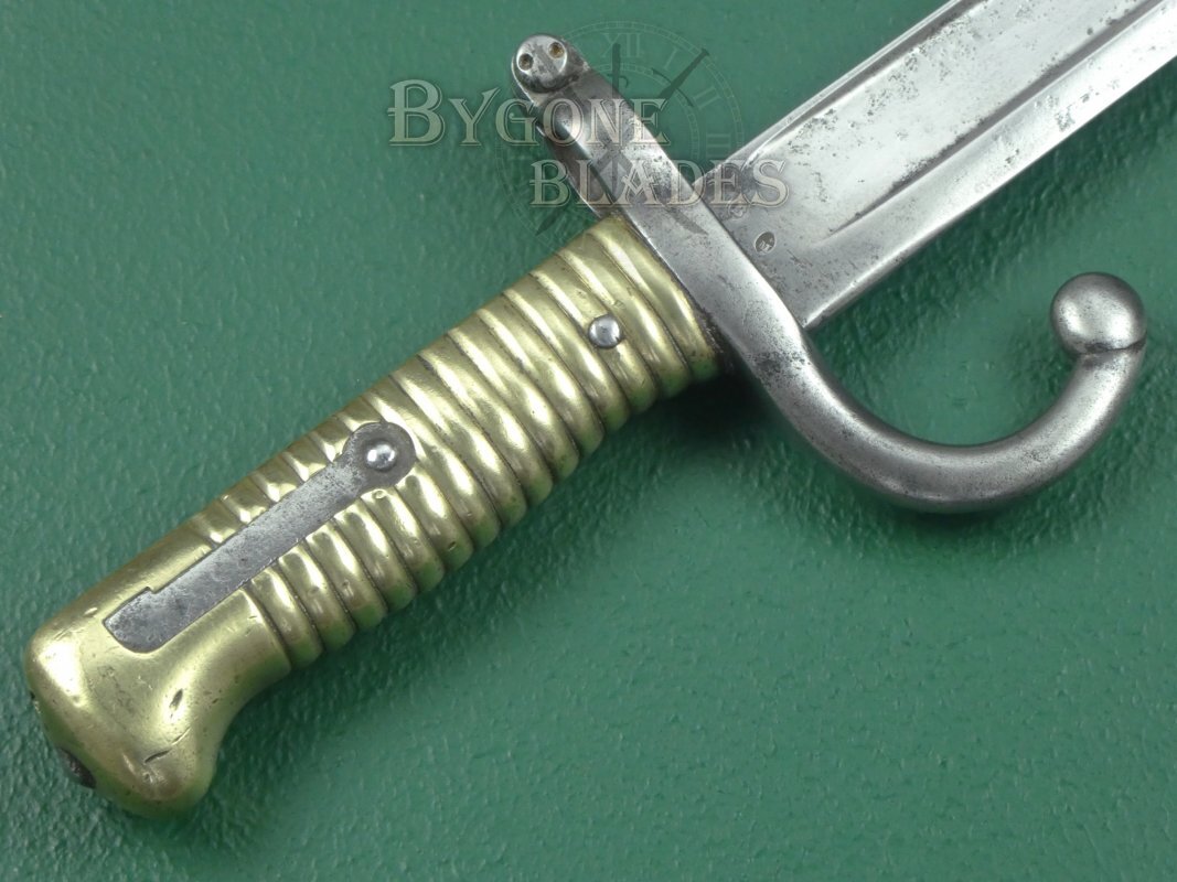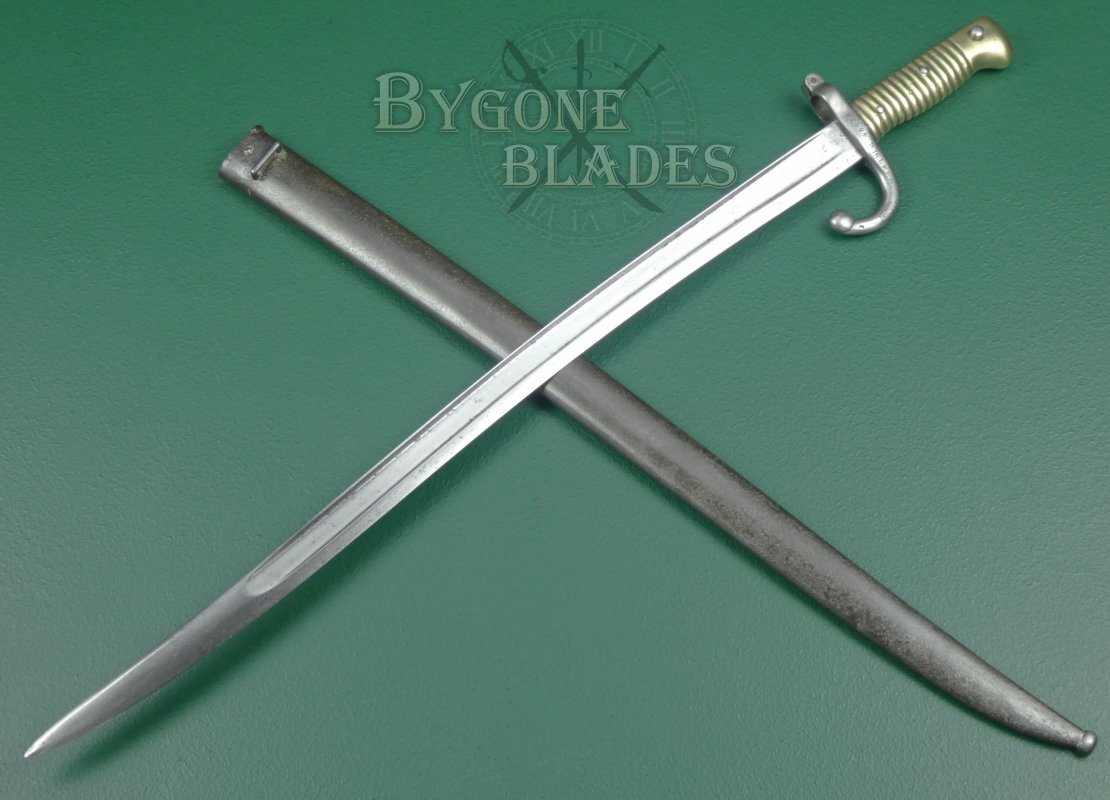 Prussian issued French model 1866 yataghan sword bayonet for the Chassepot rifled musket. After winning the Franco-Prussian War of 1870-1871, the Prussians seized French weaponry as spoils of war. Amongst these seizures were Chassepot bayonets. This bayonet was made at the St. Etienne armoury in April 1868.