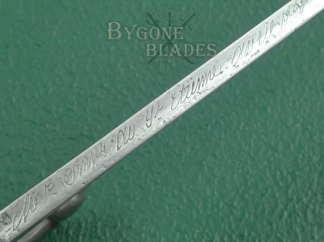 The 575mm yataghan blade is in good condition with minimal pale age-related tarnish. The blade is without damage or rust and is engraved on the spine with the arsenal name and date of manufacture, Avril (April) 1868. The ricasso bears two French inspection poincon and the obverse bears the numeral 6.