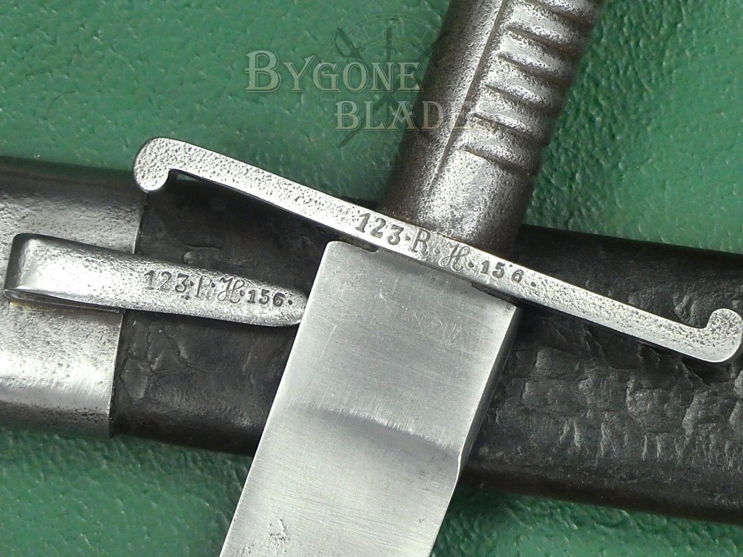 The steel crosspiece bears the unit mark: 123.R.H.156. This unit marking is repeated on the frog stud of the scabbard. The front of the crosspiece is stamped 3.2.20. The obverse of the crosspiece bears the numeral 89.