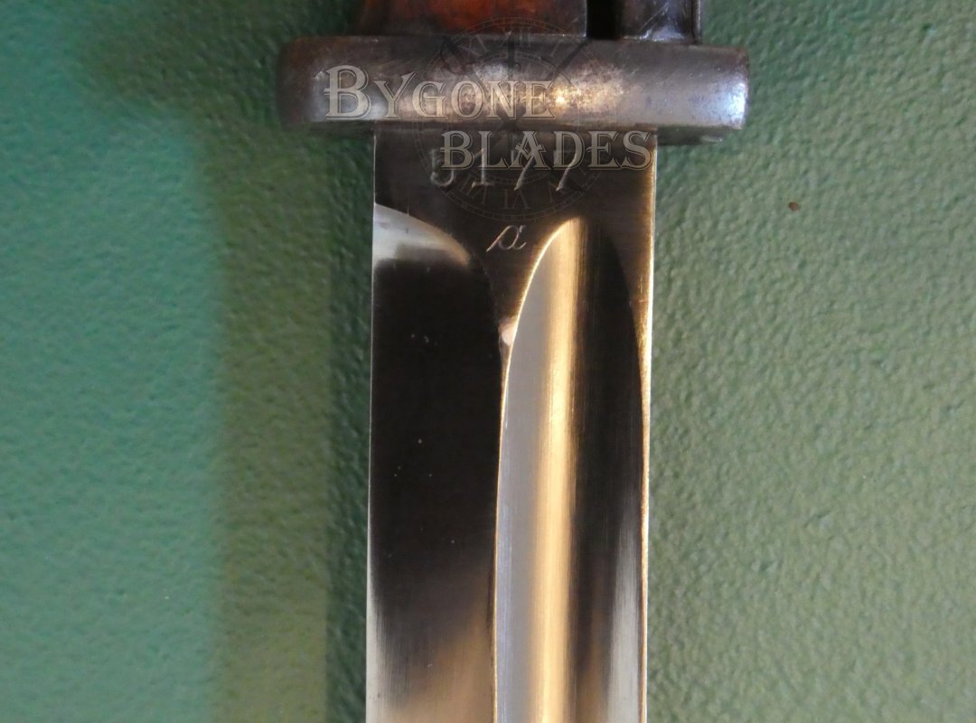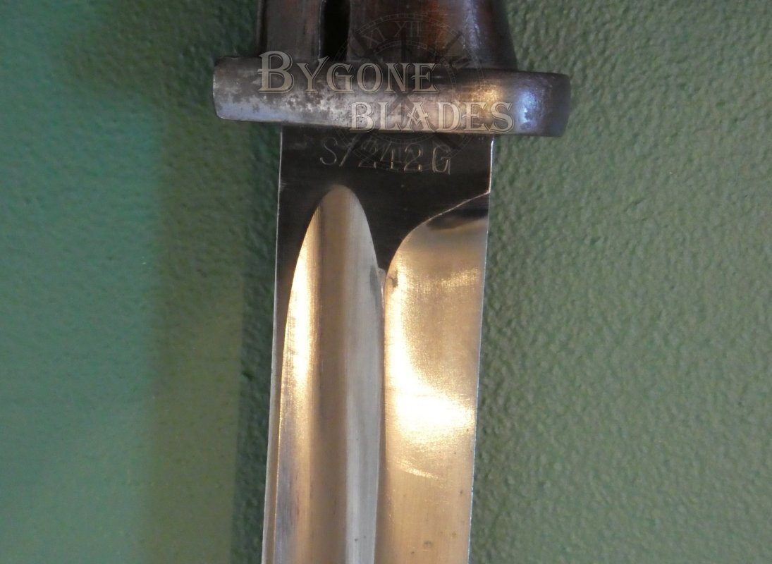 The 252mm single edged blade has a deep single fuller on both sides and is in excellent condition retaining its original blued finish with some loss due to scabbard wear. The blade is marked on the ricasso with the S-code, “S242G.” The obverse ricasso bears the stamp “5177” over an italicised letter/symbol.