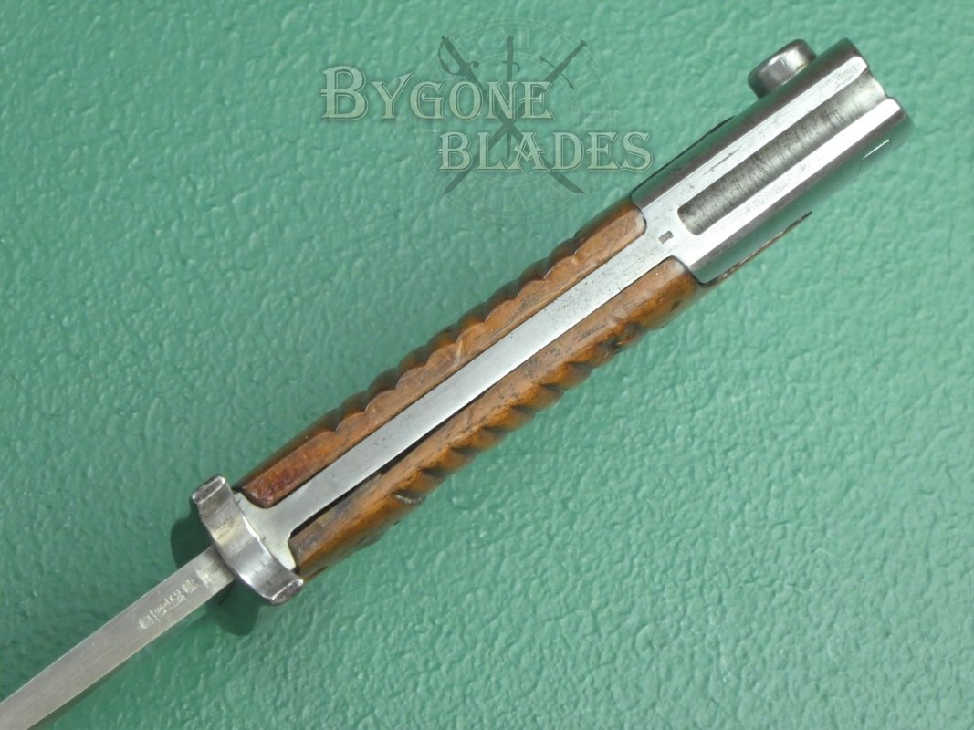 The steel of the hilt is bright and in excellent condition. The steel bears numerous inspection stamps. The screws that hold the wooden scales in place are stamped on both sides, the front of the mortice slot is stamped and the pommel bears two stamps. The press-stud mechanism is also stamped and is in good working order. The wooden scales are held firmly in place and are in very good condition with minor age related wear and marks.