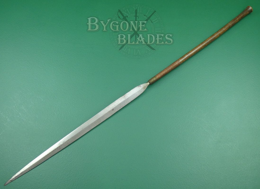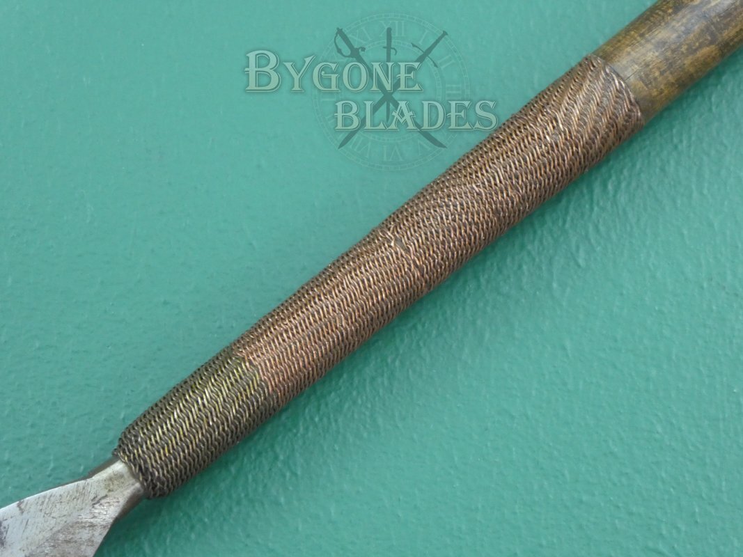 The incredibly long 588mm hand forged blade has a flattened diamond section with raised medial ridge. The blade is 35mm at its widest and is in great condition.