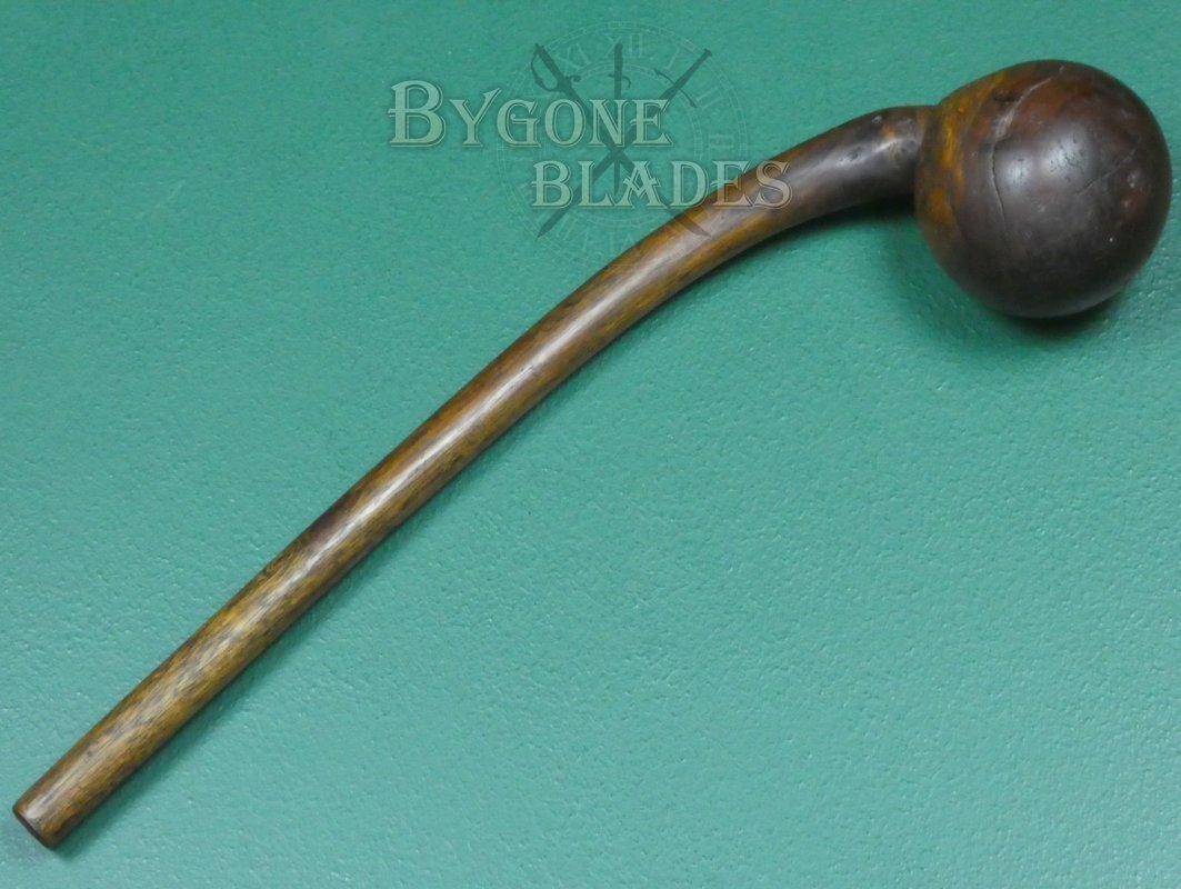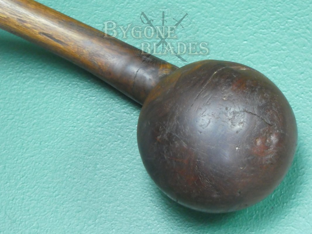 This fearsome hardwood club has an enormous head that has a diameter of 94mm across and has a depth of 87mm. The club has a total length of 465mm. The club is in great condition with minor age-related cracks to the head.