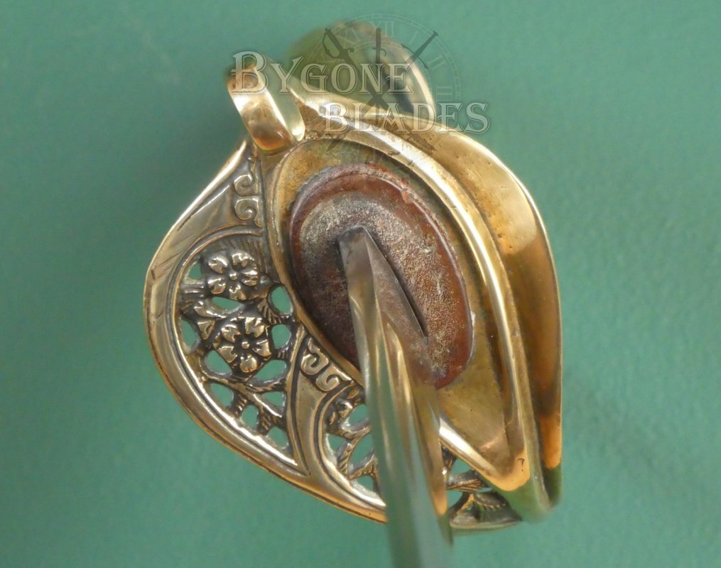 The brass hilt is in excellent condition and was clearly influenced by the hilts of mid-19th Century French army swords such as the M1845. The black horn grip is in excellent condition but lacks the twisted wire. The blade is firm in the hilt.