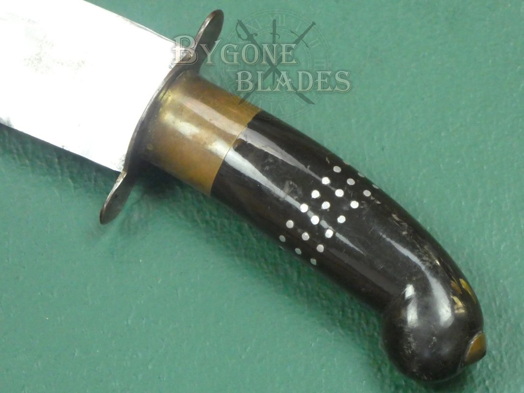 The shaped buffalo horn grip is decorated with three bands of inlaid metal dots and has a brass bolster with a plated steel crosspiece. The tang of the blade is peened through the pommel of the grip. The blade is firm in the hilt.