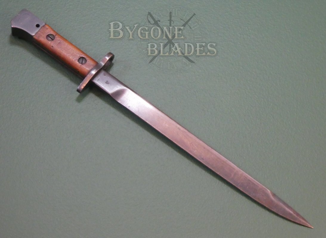 The 304mm single-edged blade has a rounded spine and upper false edge. The un-fullered blade terminates in an asymmetrical spear point. The blade is in good condition with its original blued finish and factory edge. There is some mild wear to the blueing.