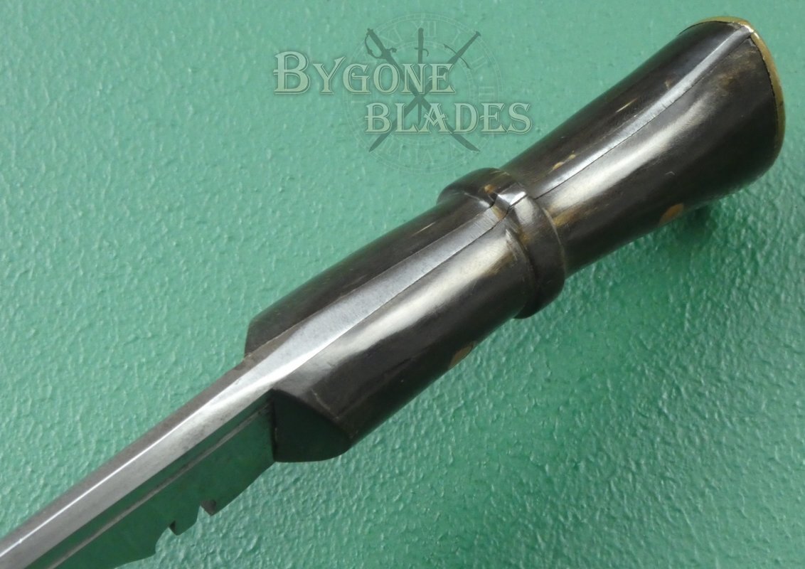 The buffalo horn grip scales are firmly fixed to the solid tang by two brass rivets. The tang is double peened through an oval brass butt plate. The grip flares to a broad oval at the base allowing the user a very good grip. The horn grip has carved ridges and is in excellent condition.