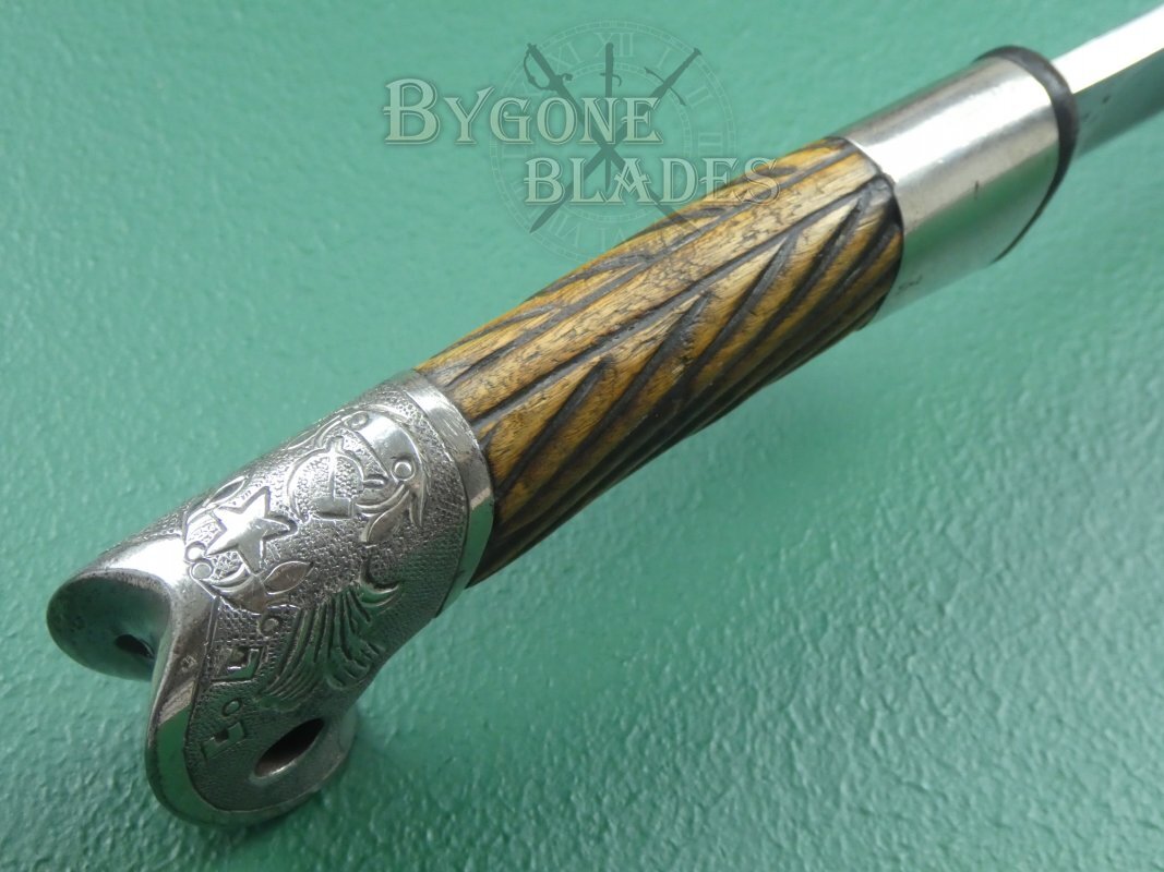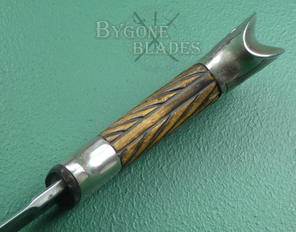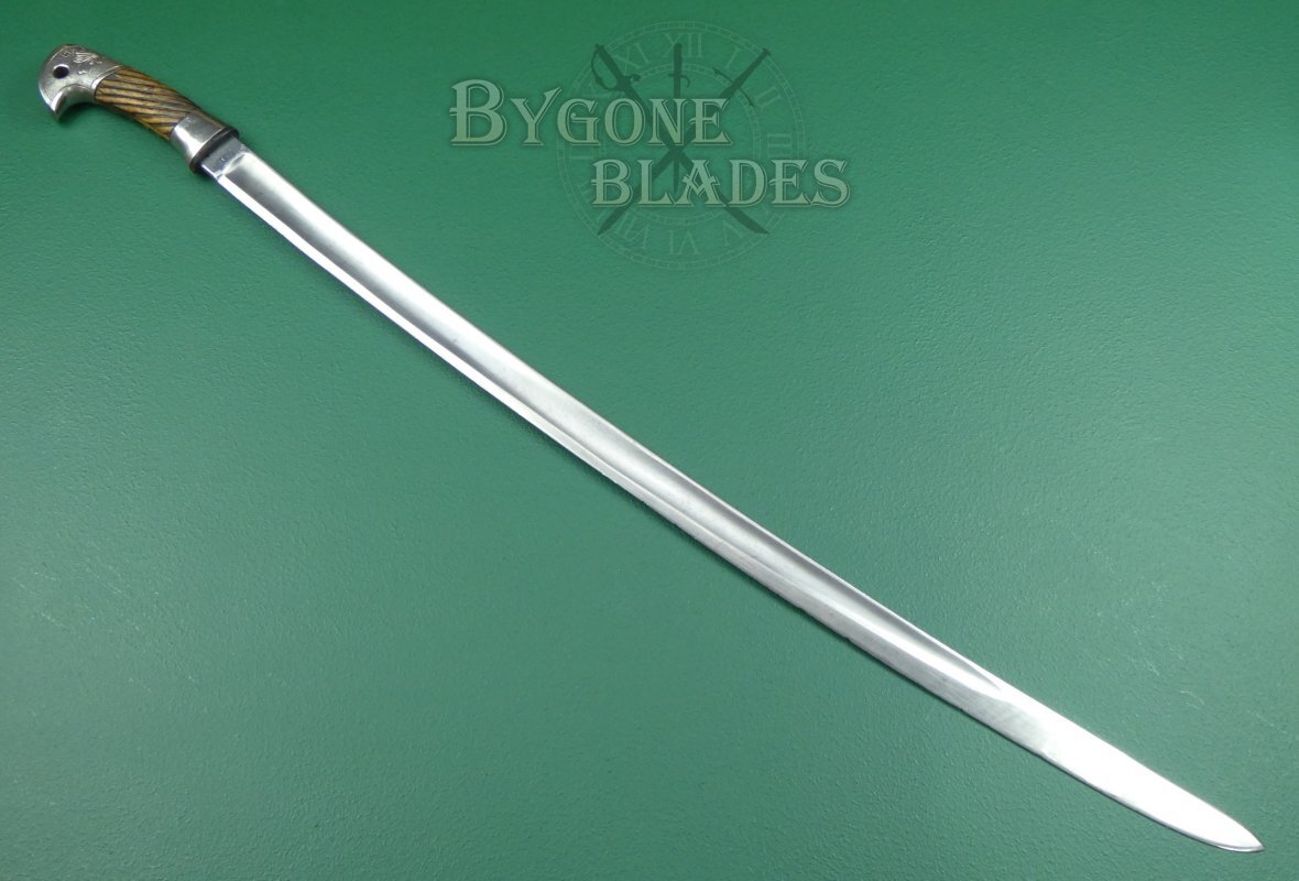 The shashka is complete with its scabbard with plated steel mounts and Model 1891 Mosin Nagant bayonet. The M1891 is one of the scarcer Mosin nagant carbine bayonets. The sword was worn in a scabbard suspended with the edge uppermost. The scabbard is in very good condition and the sword sheathes and draws smoothly and is held firmly within.