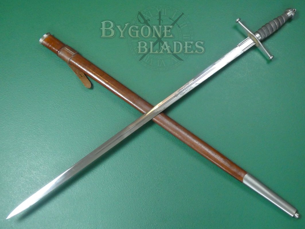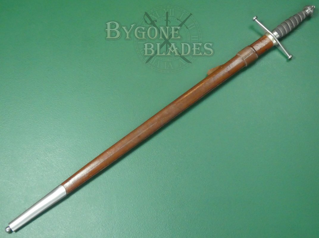 The broadsword is complete with its brown leather covered field service scabbard with a steel chape ending in a ball. The scabbard is in good condition with minor age and use-related scuffs. The sword sheathes and draws smoothly and is held firmly within the scabbard.