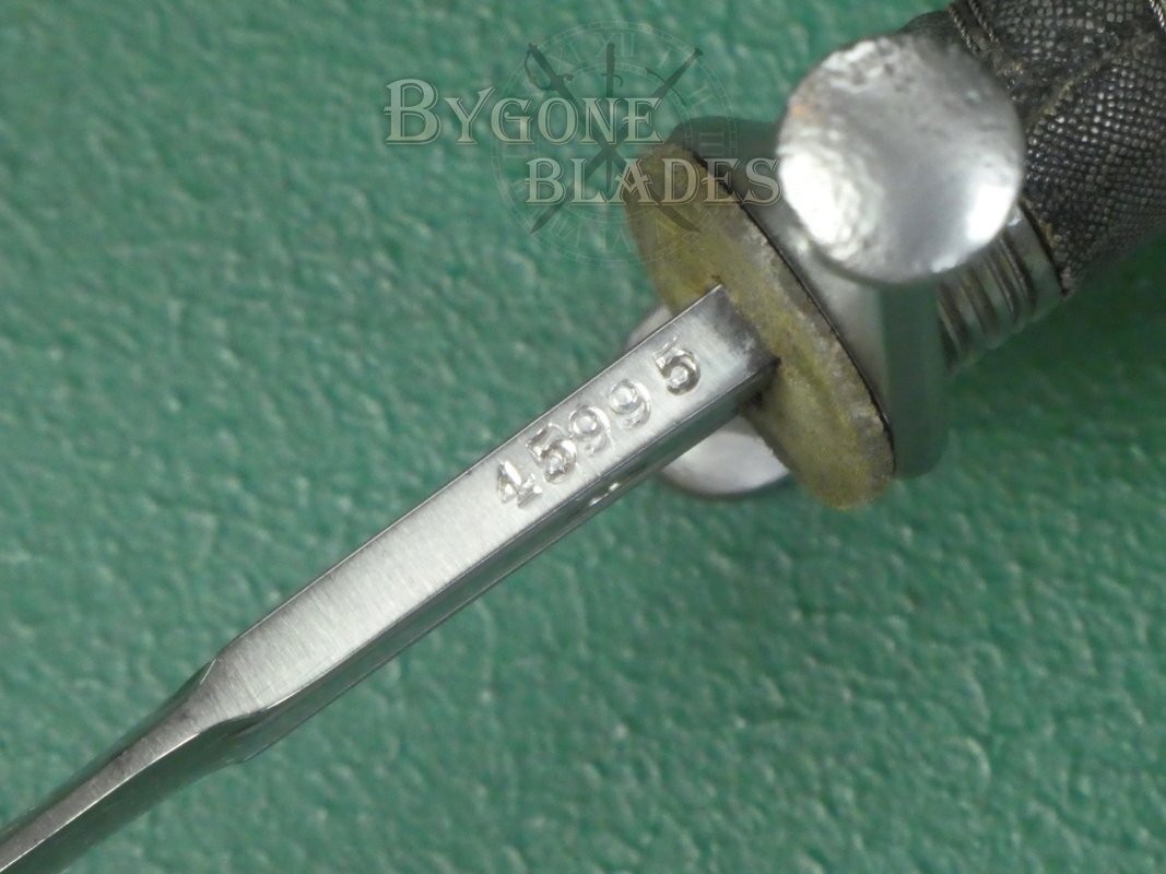 The ricasso bears a brass proof disk faintly showing the scripted HW of the Wilkinson Sword Company. The obverse ricasso is blank. The blade retains its original washer. The spine of the ricasso is stamped with the Wilkinson serial number 45995.