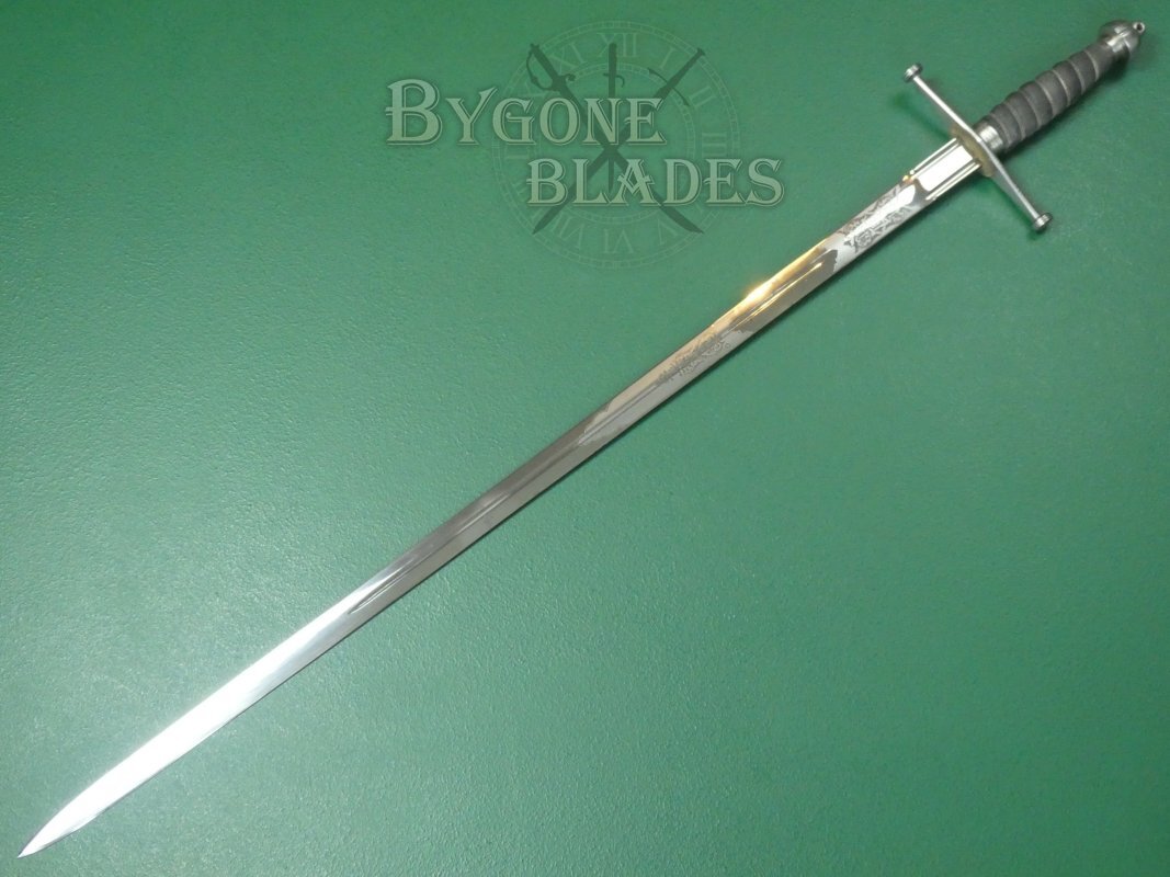 The 825mm double-edged (broadsword) blade has a deep central fuller and terminates in a spear point. The blade retains its factory sharpened edges and is in near mint condition with just a small patch of pale tarnish at the mid-point on one side. The blade is etched with thistles and foliate scrollwork. The obverse is similarly etched.