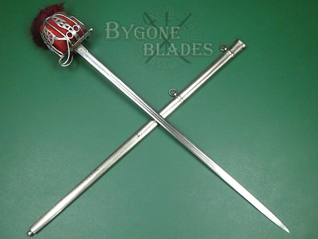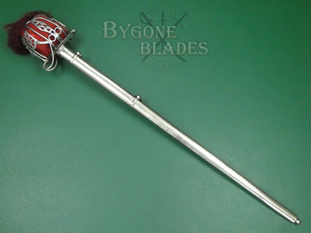 The sword is complete with its plated steel scabbard with twin suspension rings and ball finial to the bottom. The scabbard is in good condition with speckled tarnish, pin-prick bubbling and small losses to the plating. The sword sheathes and draws smoothly and is held firmly within the scabbard.