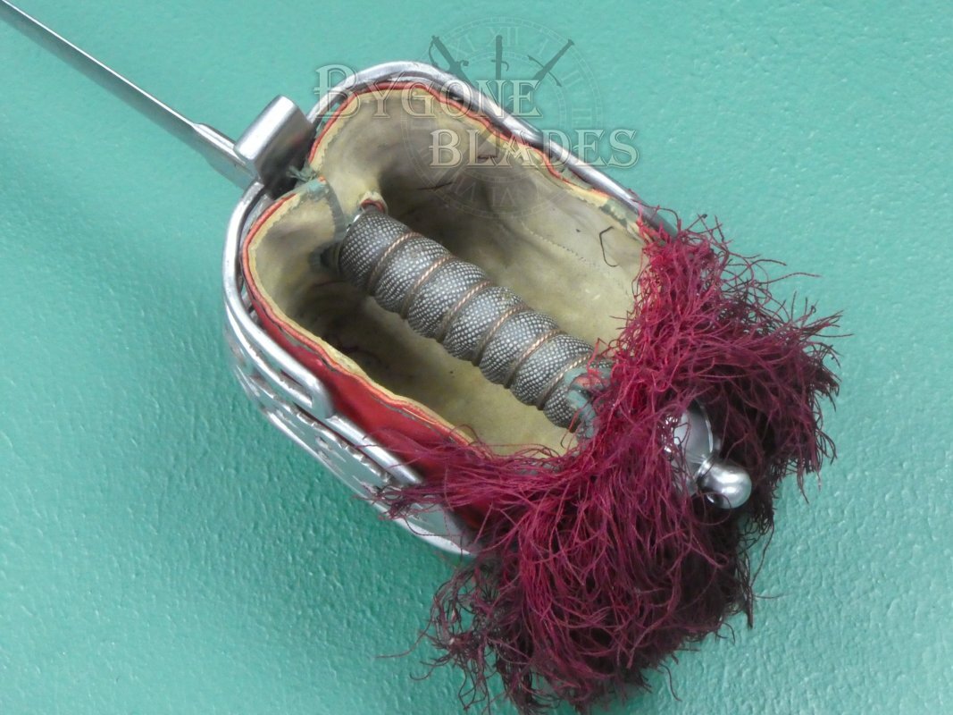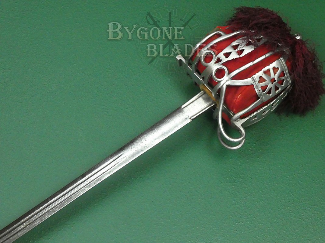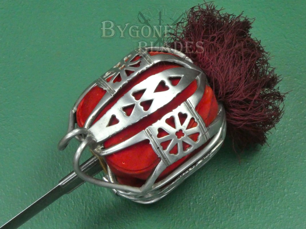 The 1828 pattern basket guard is in good condition and retains its red liner and tassel, albeit with some wear and discolouration.