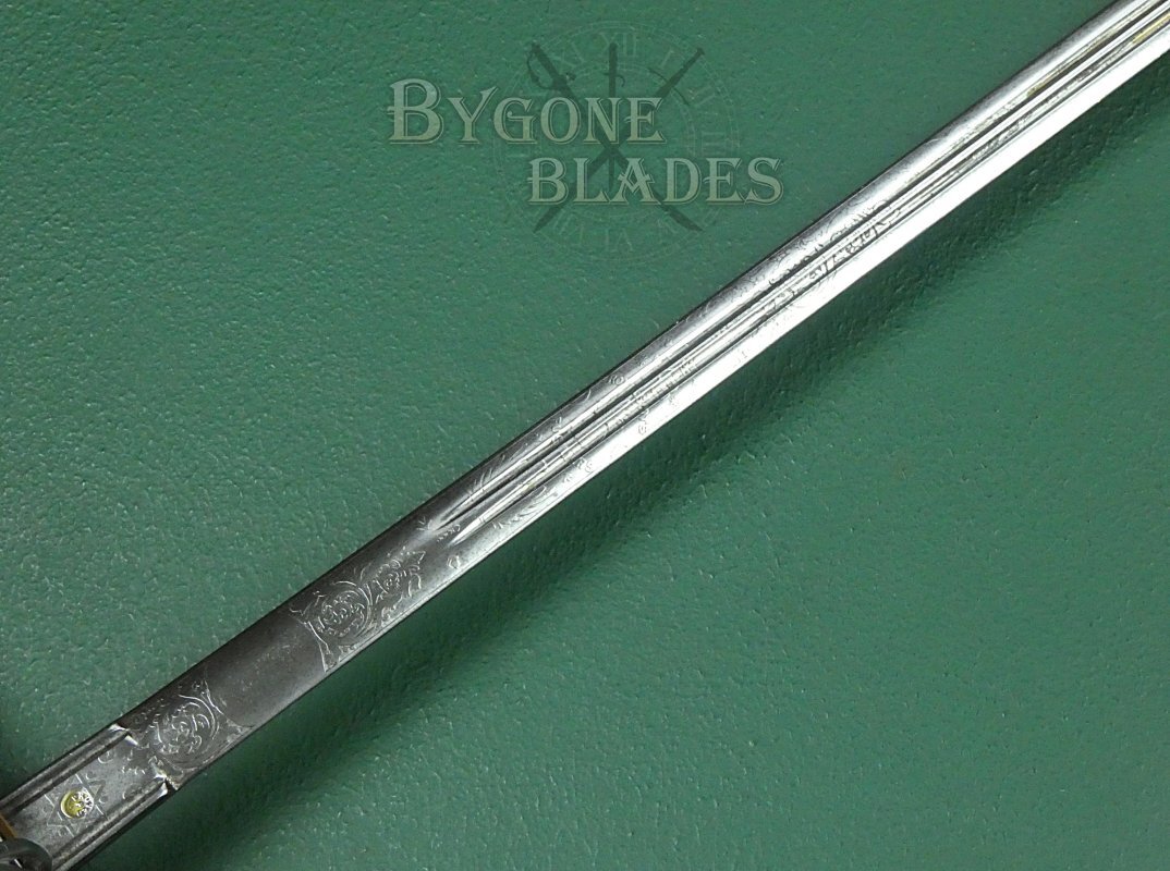 The 830mm double-edged (broadsword) blade has twin, three-quarter length fullers and terminates in a spear point. The blade is etched with foliate scrollwork and arches above and below the flaming grenade of the fusiliers with the regimental title, “1st V. B. Royal Scots Fusiliers” encircling the grenade. The grenade bears a thistle motif. A larger thistle is etched below the regimental emblem. The obverse of the blade is similarly etched with foliate scrollwork and ogee and trefoil arches and bears the royal cypher of Queen Victoria.