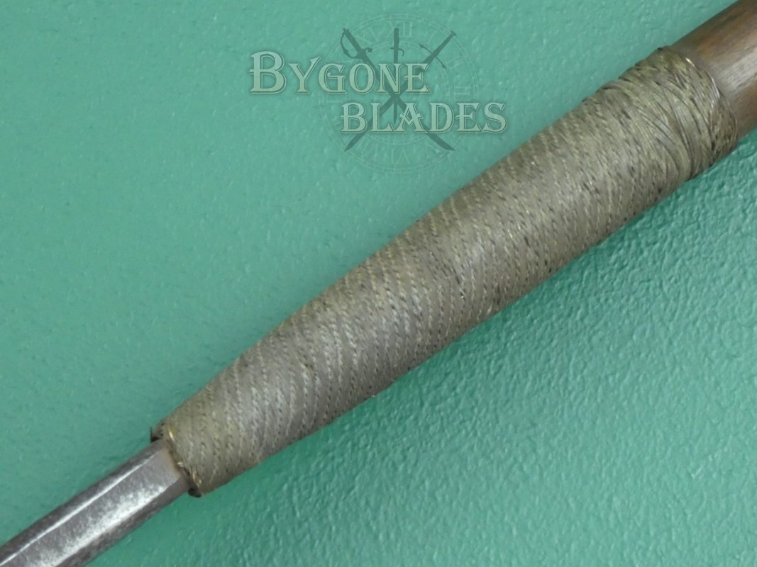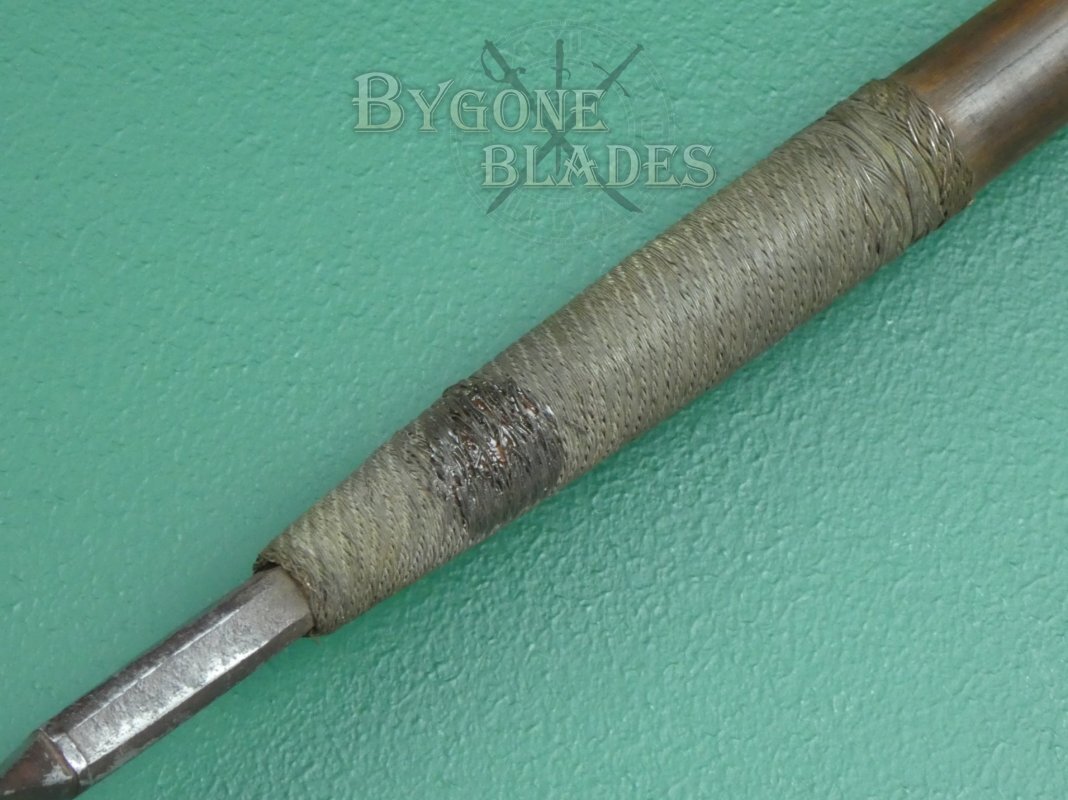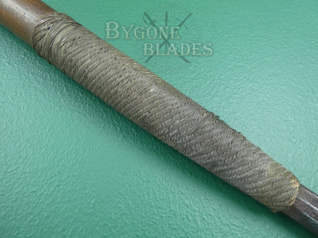 The hand forged blade measures 340mm from the top of the woven brass wire and has a flattened diamond section with raised medial ridge. The blade is 56mm at its widest and is in worn condition with pitting, tarnish and edge nicks that are testament to its age and use and add to its character.