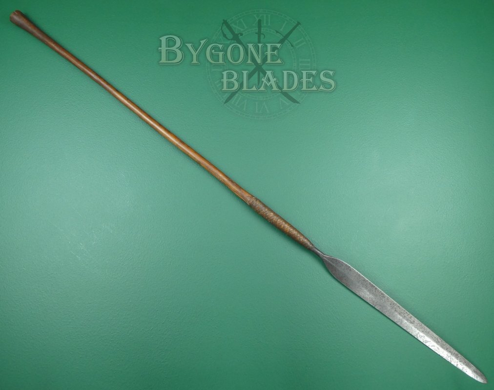 The long 450mm hand forged blade has a flattened diamond section with a raised medial ridge. The blade is 43mm at its widest and is in good condition with a pleasing patina and clear forging marks that add to its character.