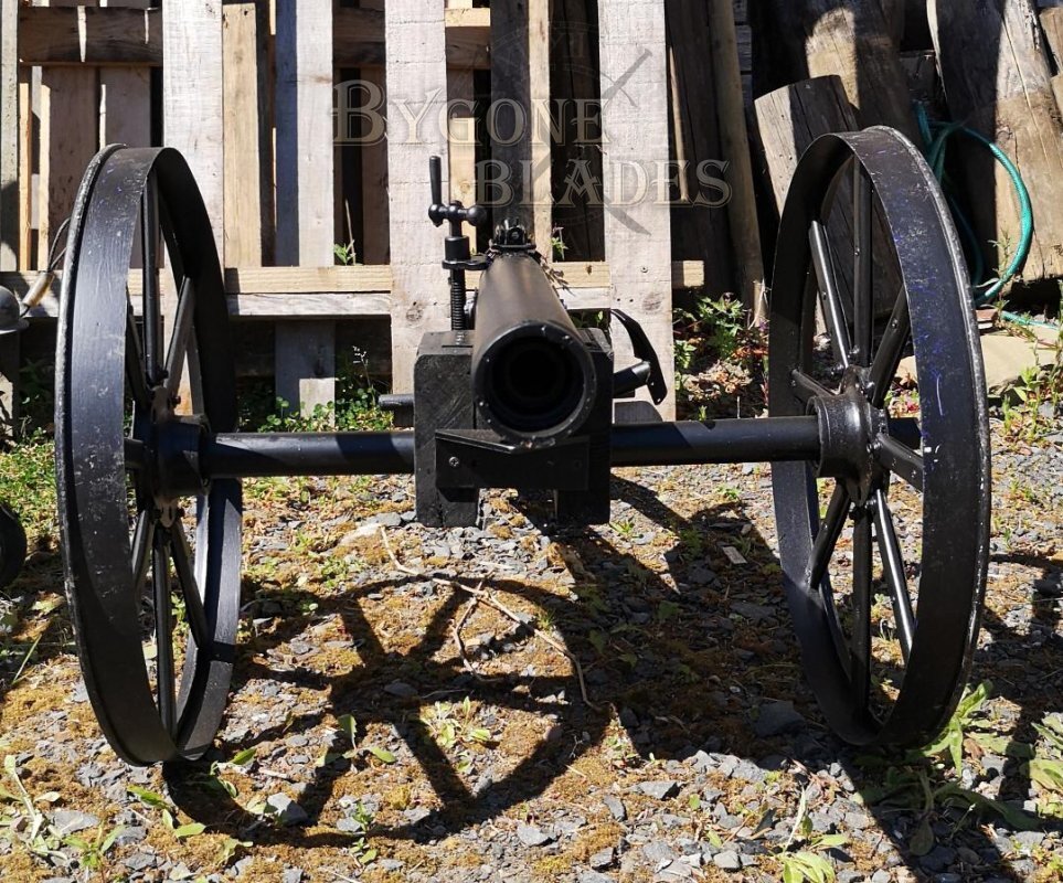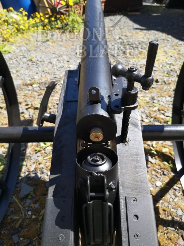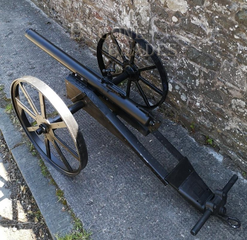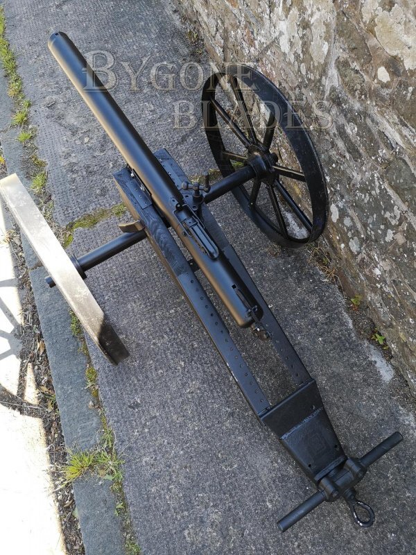 This blank firing signal cannon is approximately 1/3 scale and, I believe, is a copy of an American Civil War cannon. The cannon was a home built project and is in fully working order. As a decorative item it is legal to own without the need for a license and in the UK, 12 Bore blanks can be purchased online or from a gunsmith.