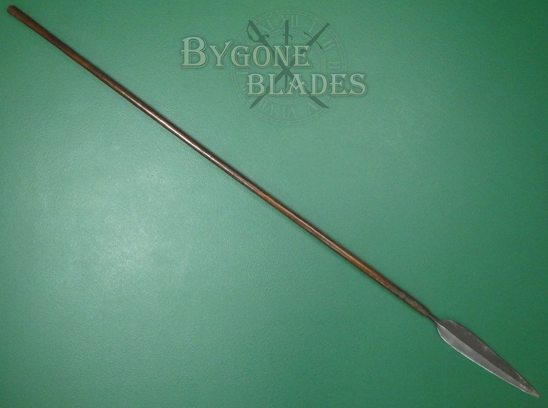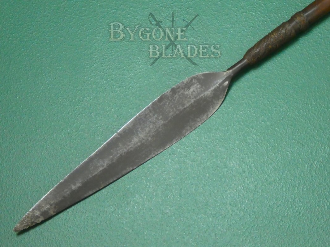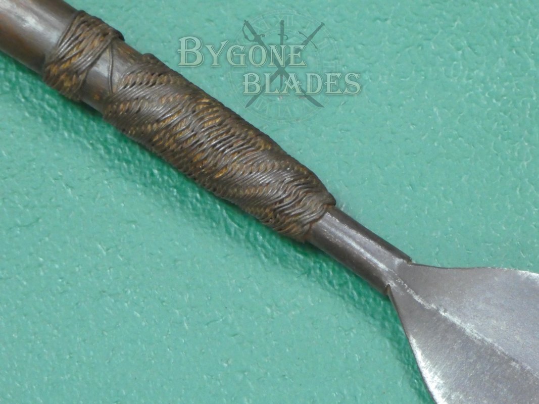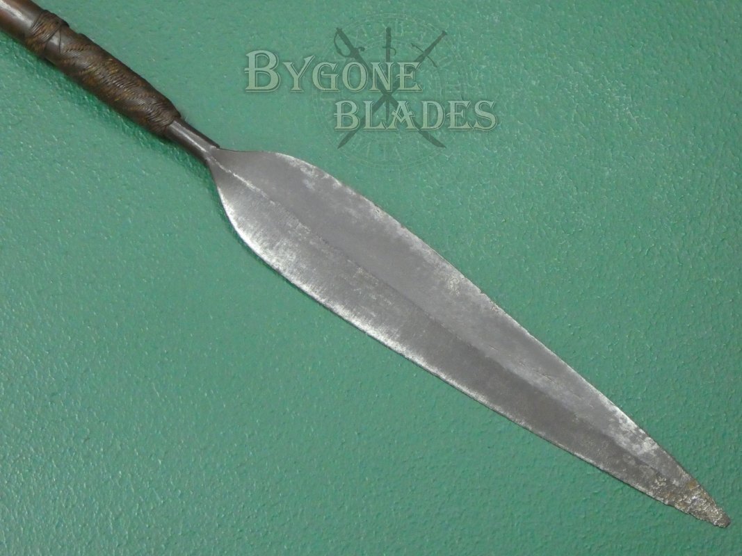 This is a great example of a Zulu Iklwa with a broad, leaf-shaped blade and moderate flare to the end of the haft. Many Zulu weapons, like this one, were collected by the British troops and brought back to the UK as souvenirs after the Anglo-Zulu War of 1879.