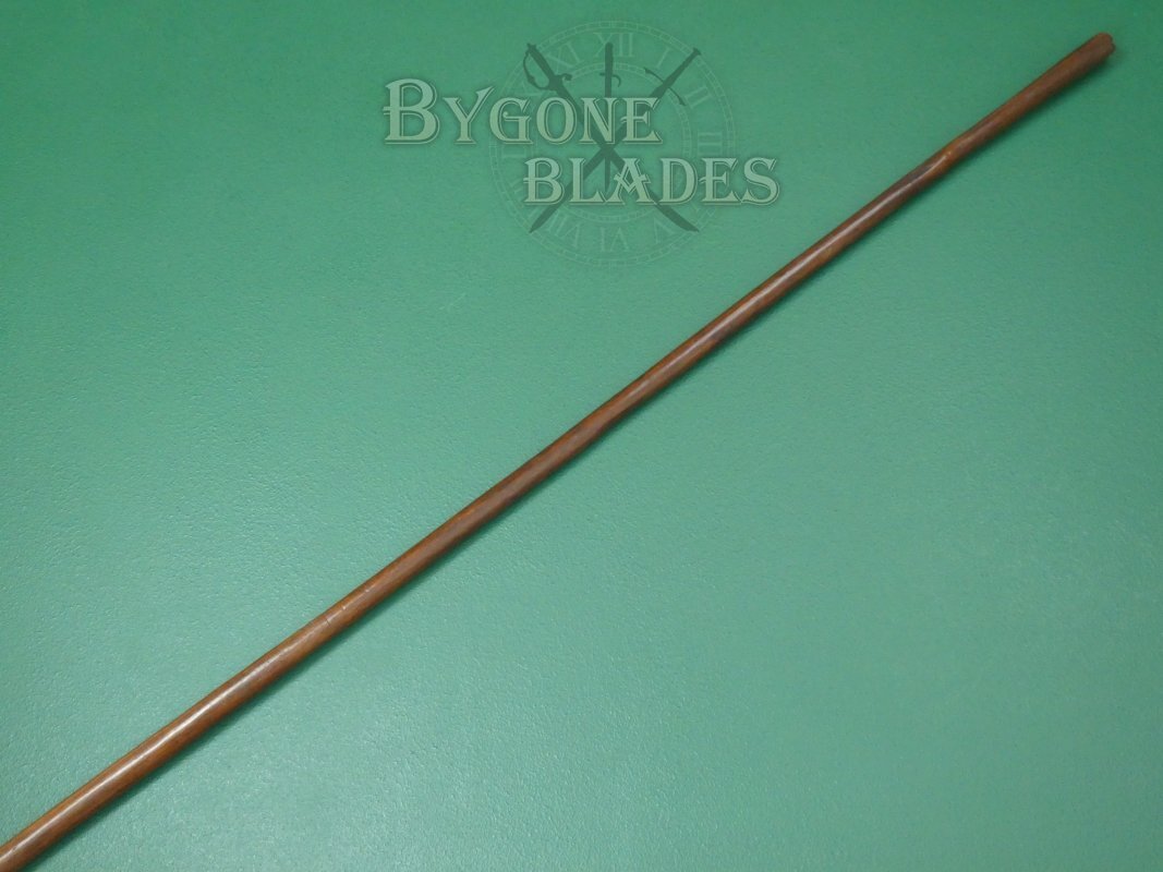 The haft has a moderate flare to the end and a wonderful patina. The total length of the iklwa is just over 56 inches/143cm. A longer haft was needed to balance the weight of the blade. The balance point being a hand-and-a-half from the lower ring of wire.
