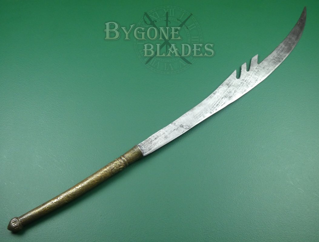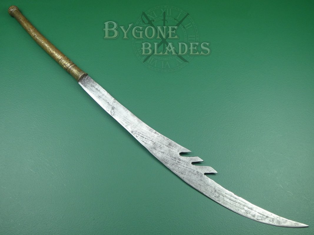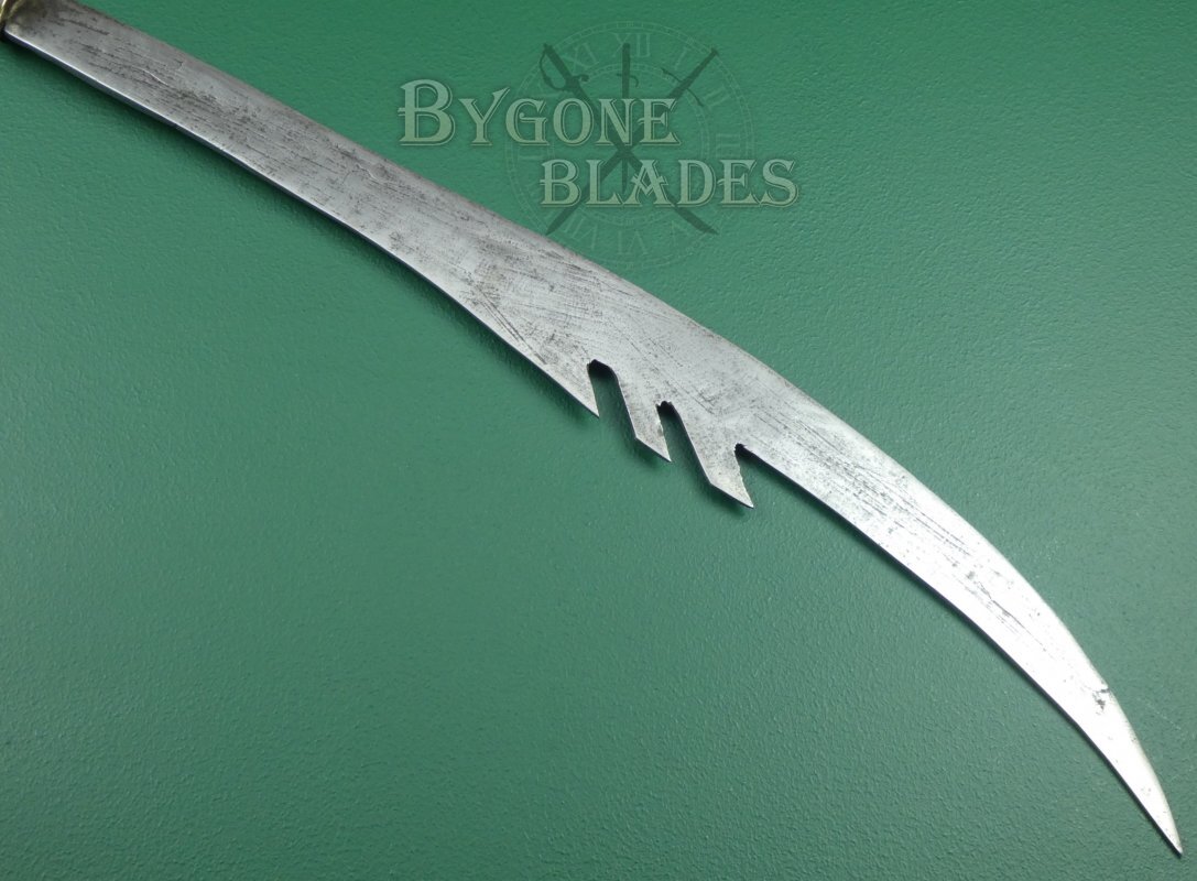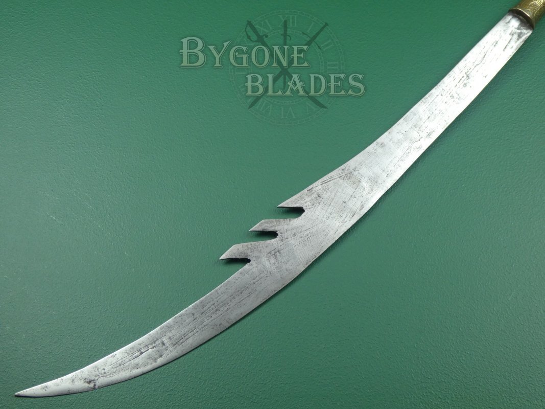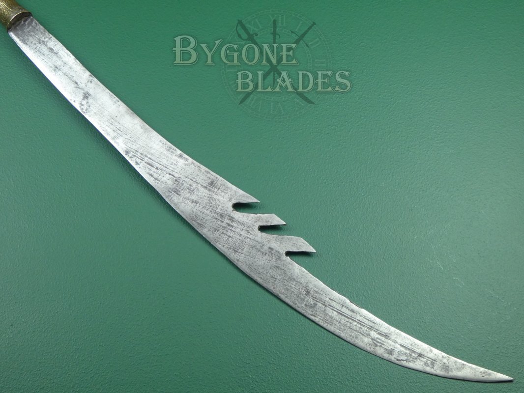 The 744mm single-edged blade has a thick spine incorporating three deep forward pointing notches and terminates in a wickedly sharp point. The spine measures 6mm thick and tapers to 2.6mm at the point. The curved blade is 38mm wide at the shoulder increasing to 82mm at its widest. The heavy forged blade retains a sharp fighting edge.