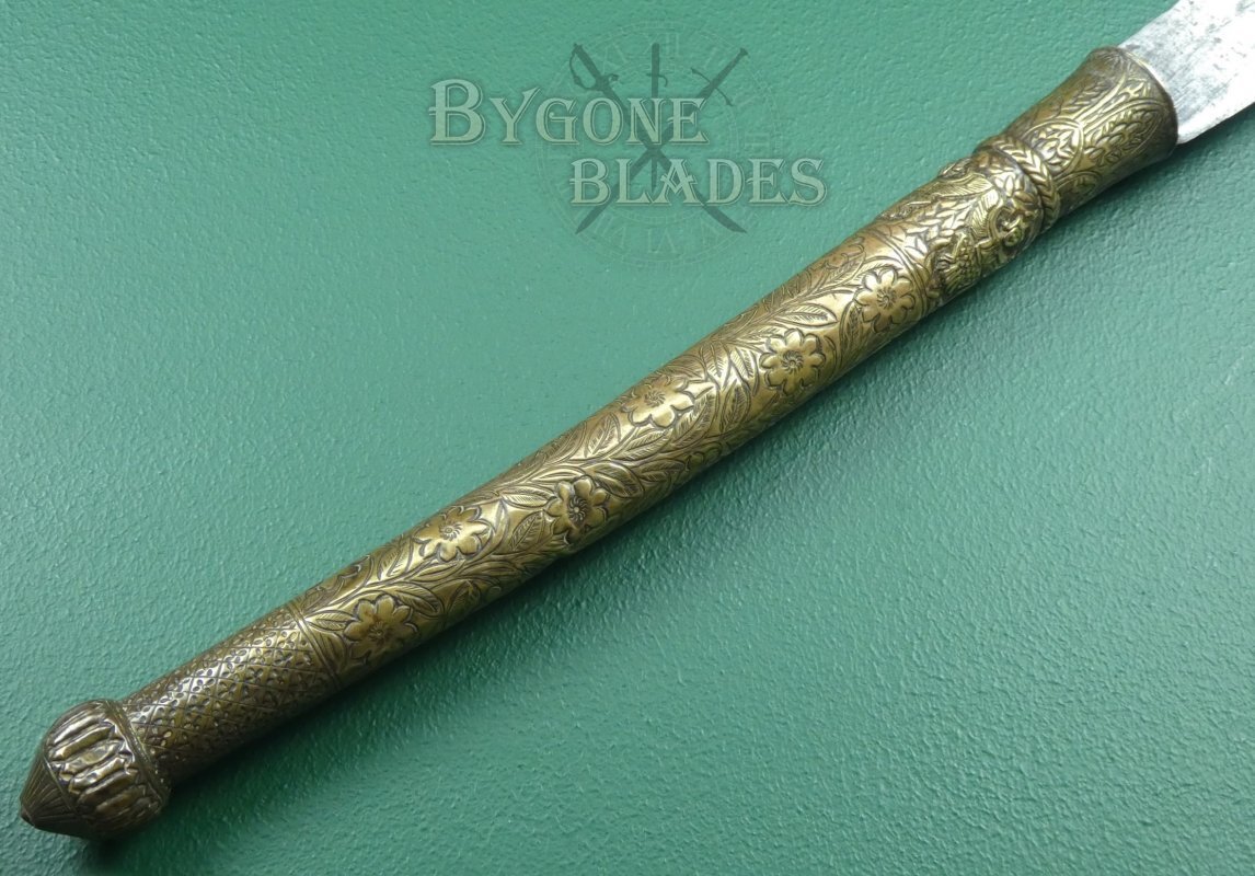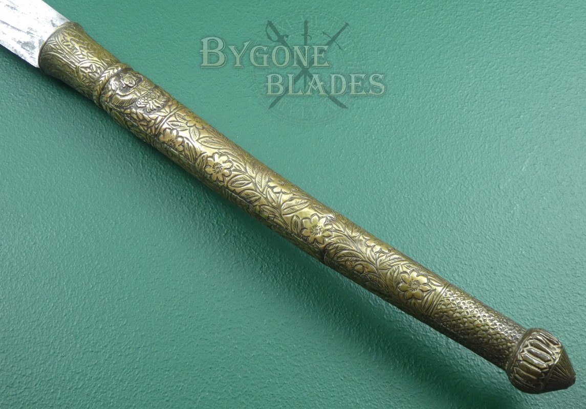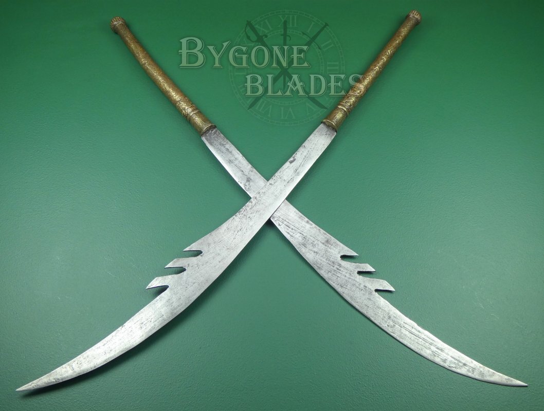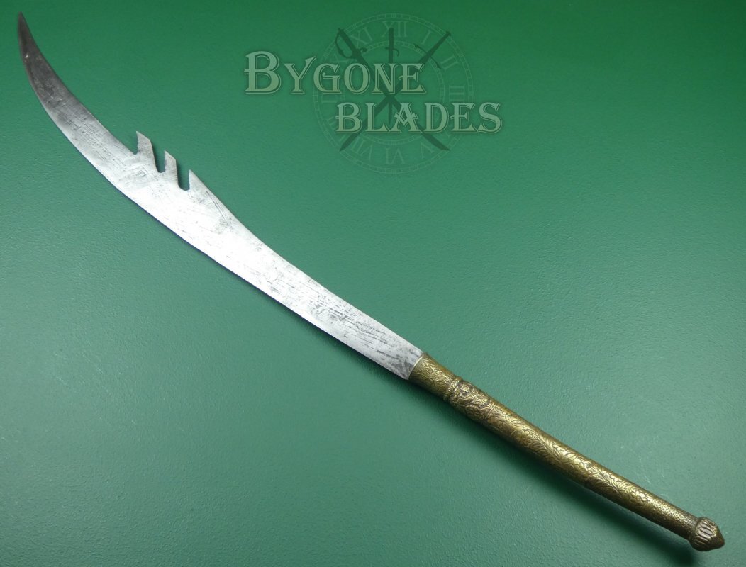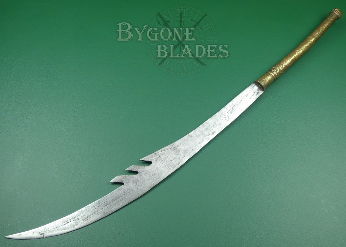 The 744mm single-edged blade has a thick spine incorporating three deep forward pointing notches and terminates in a wickedly sharp point. The spine measures 6mm thick and tapers to 2.6mm at the point. The curved blade is 38mm wide at the shoulder increasing to 82mm at its widest. The heavy forged blade retains a sharp fighting edge.