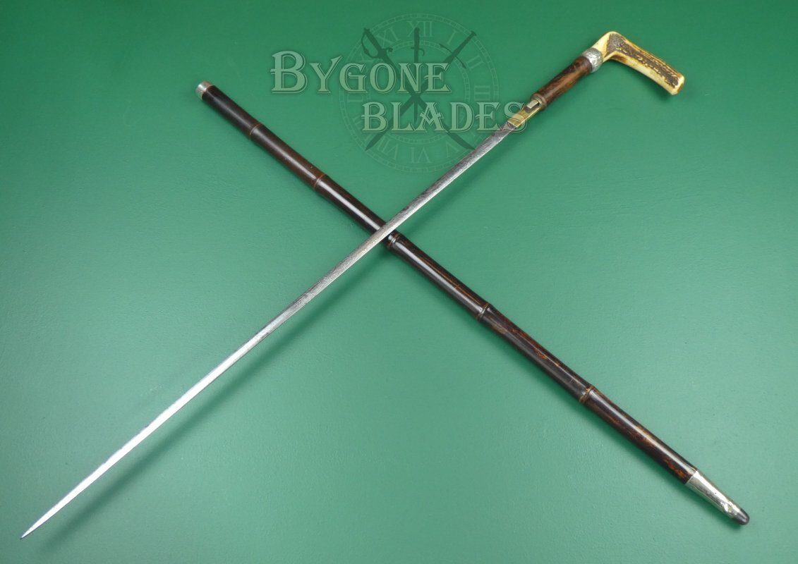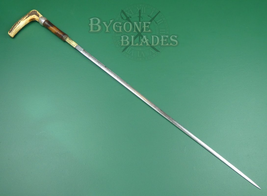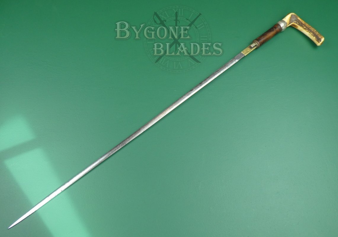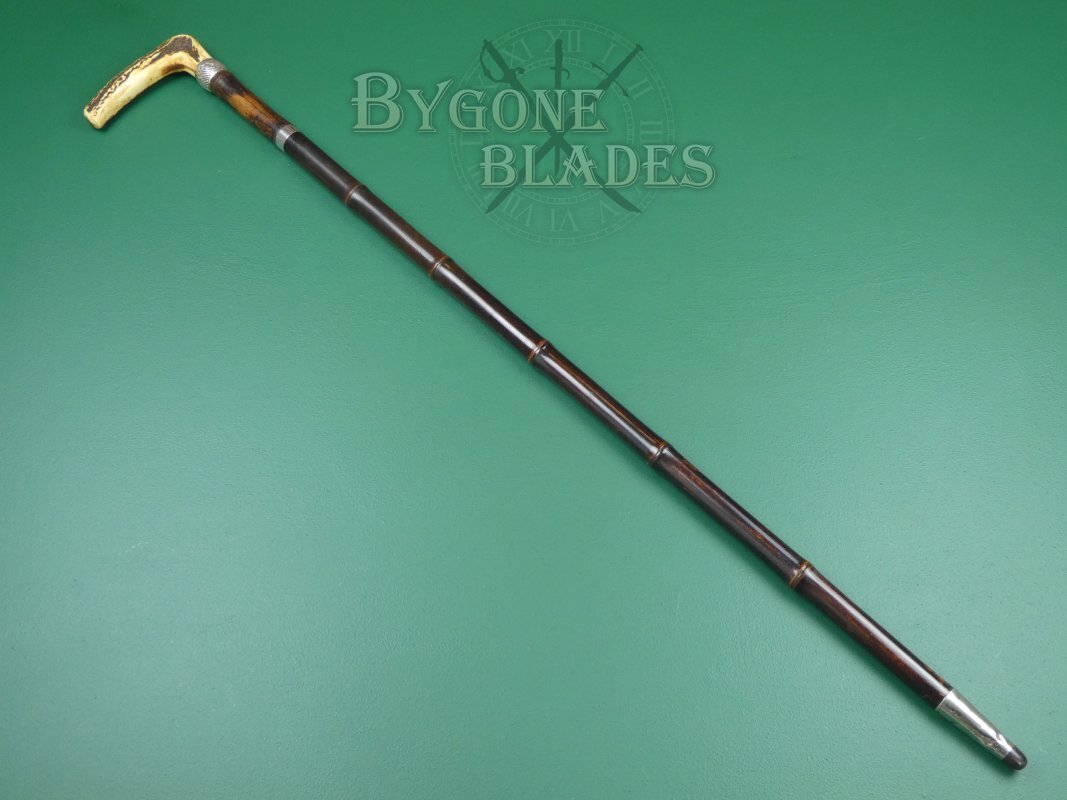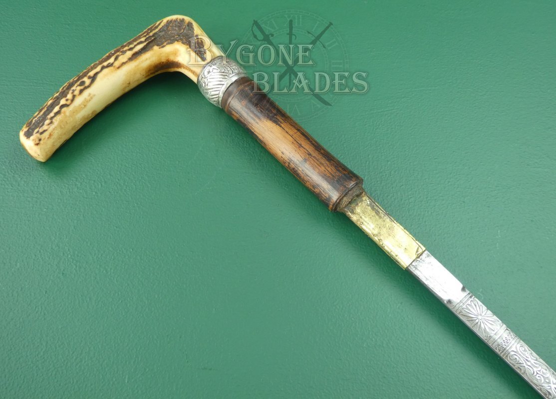This excellent Victorian sword cane has a deer antler handle with an ornate silver collar. The silver collar has a cartouche faintly engraved with the owner’s initials, “J. N.”