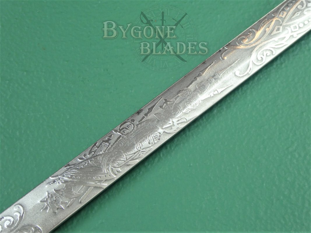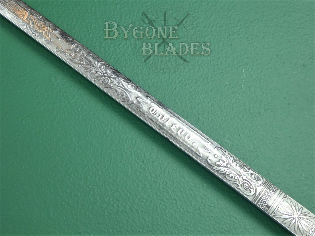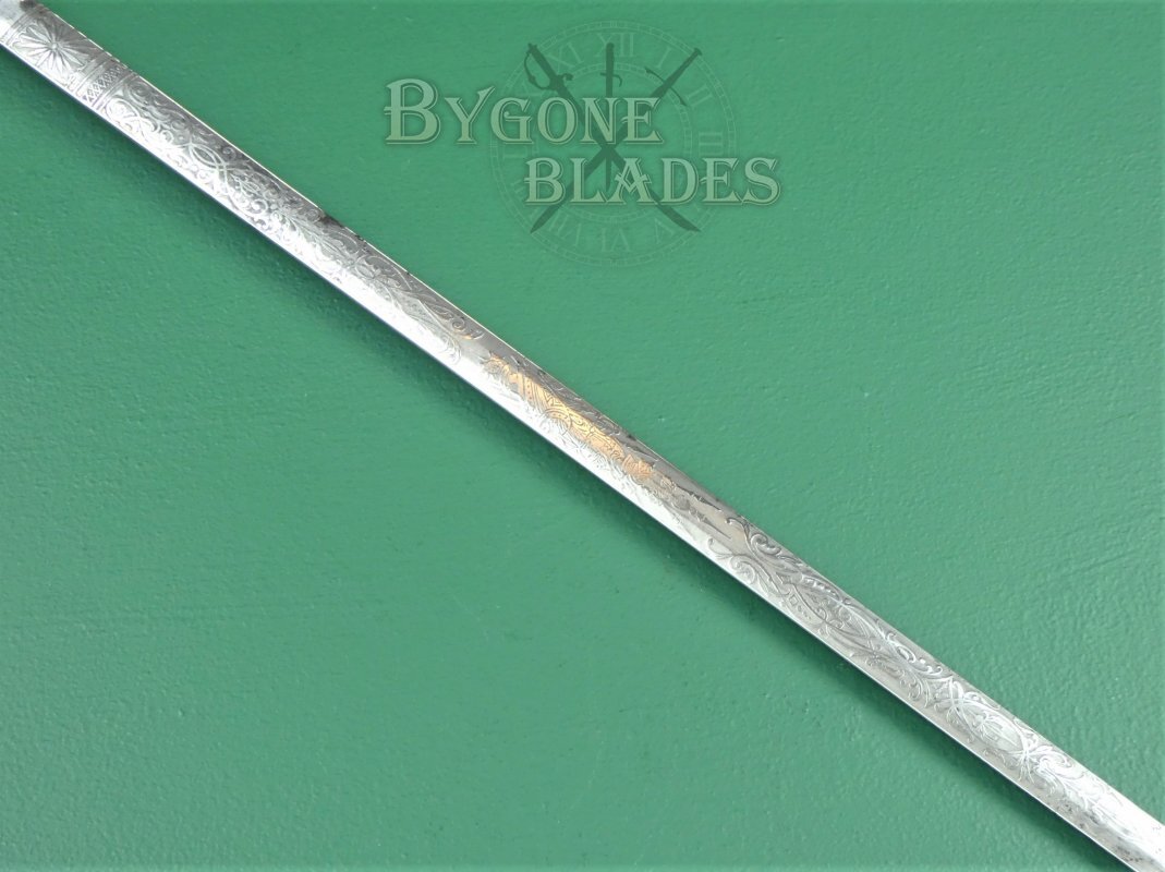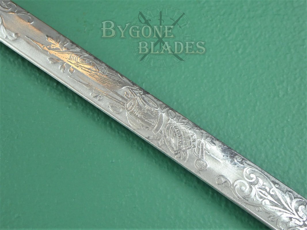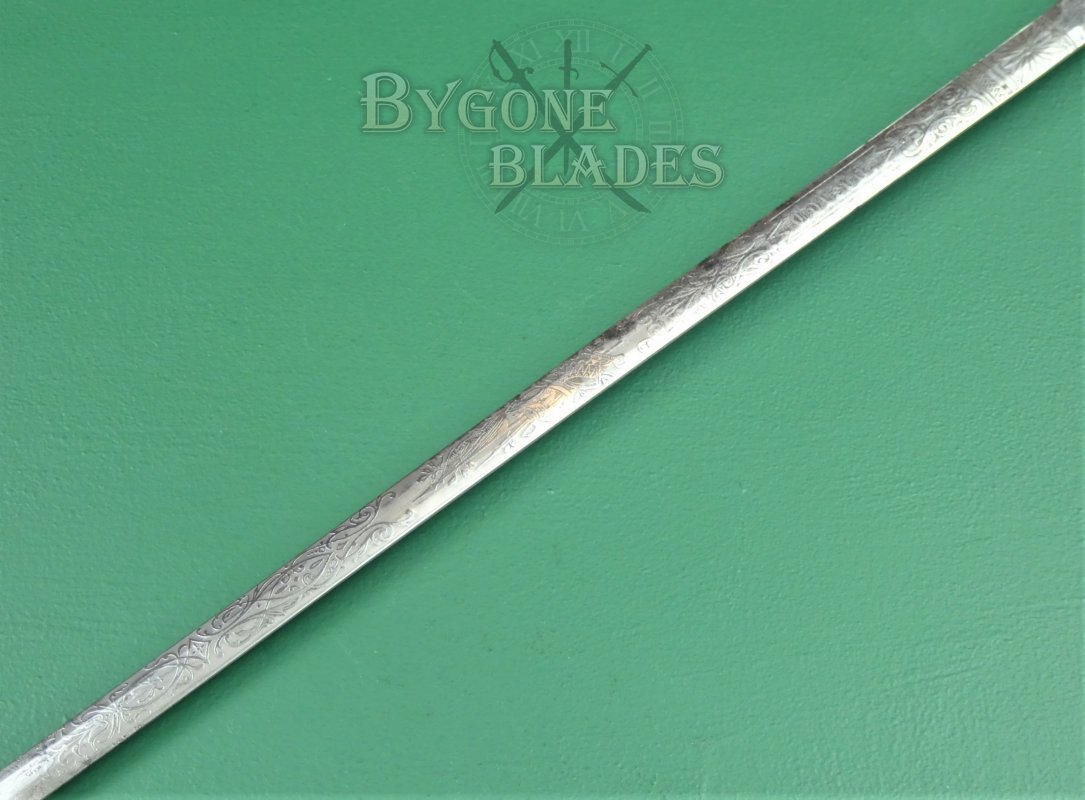 The 695mm double-edged blade tapers to a spear point. The blade is in very good condition and is crisply etched with stylised flowers, foliate scrollwork and trophies of arms. The obverse is similarly etched and includes a different stand of arms and a cartouche containing the word “Toledo.”