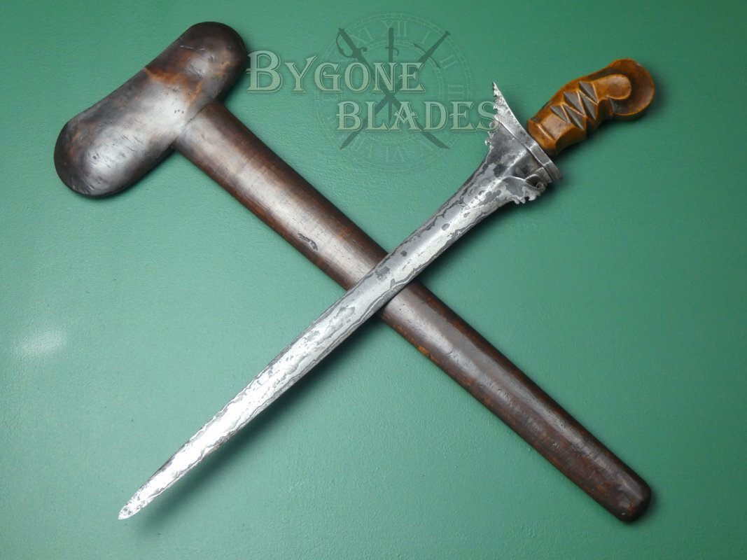 The Kris is complete with its hardwood scabbard which is in good condition. The blade sheathes and draws smoothly.