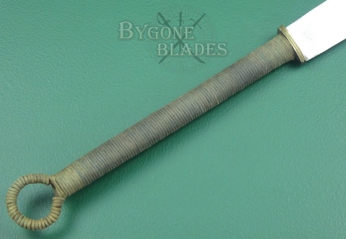 The green cord wrapped grip is 395mm long and consists of the blade’s tang, which also forms the circular end to the grip, encased in wood and bound with cord. The cord is intricately knotted along the left-hand side of the grip.