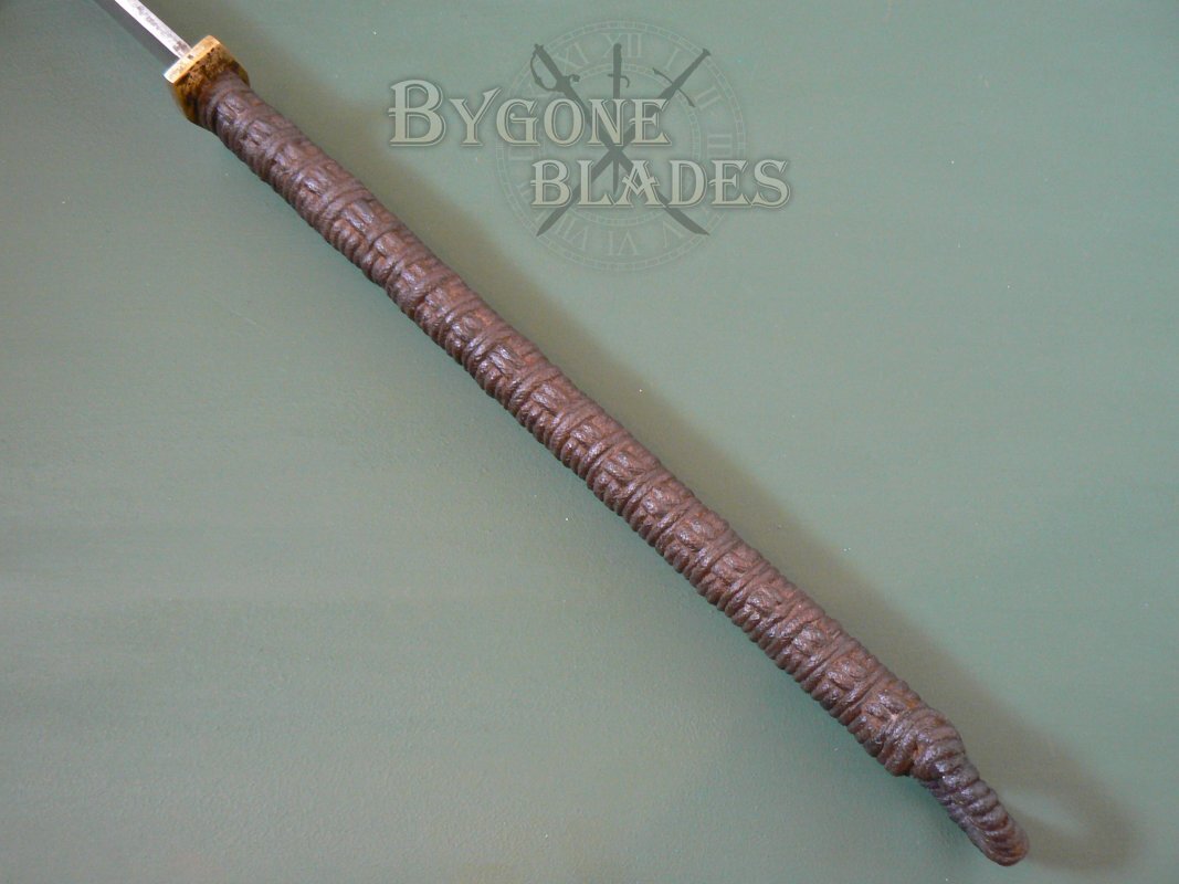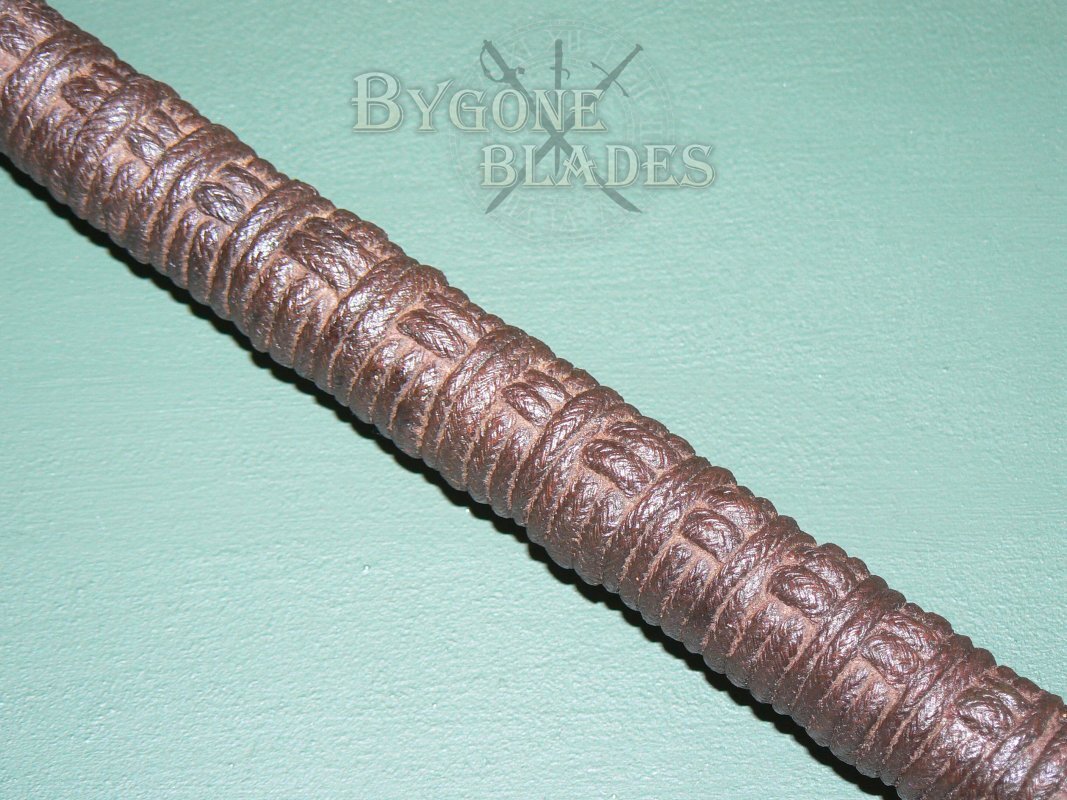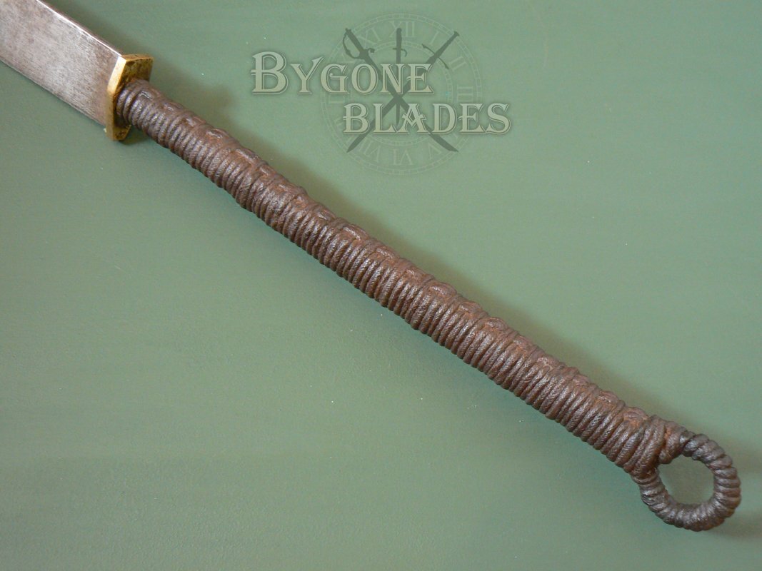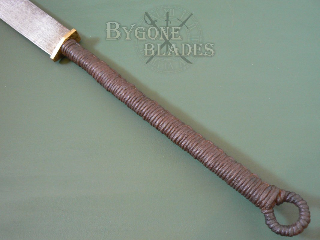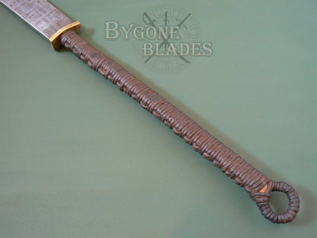 The cord wrapped grip is 386mm long and consists of the blade’s tang, which also forms the circular end to the grip, encased in wood and bound with cord. The cord is intricately knotted along the spine of the grip.